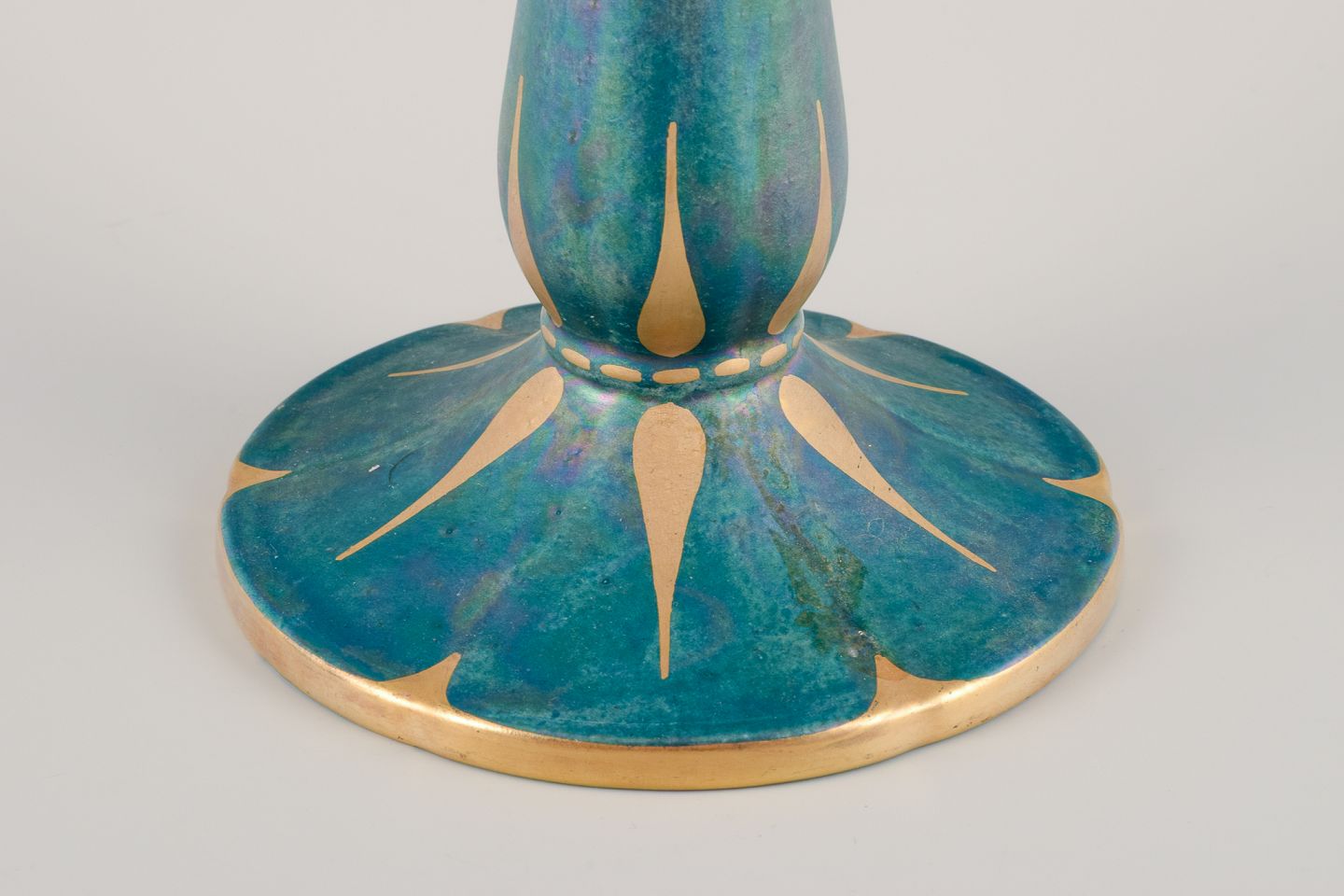 Josef Ekberg (1877-1945) for Gustavsberg, Sverige. Et par lysestager med glasur i grønblå toner, gulddekoration. Midt 1900-tallet. Stemplet. Perfekt stand. Mål: D 12,5 cm. x H 13,5 cm.