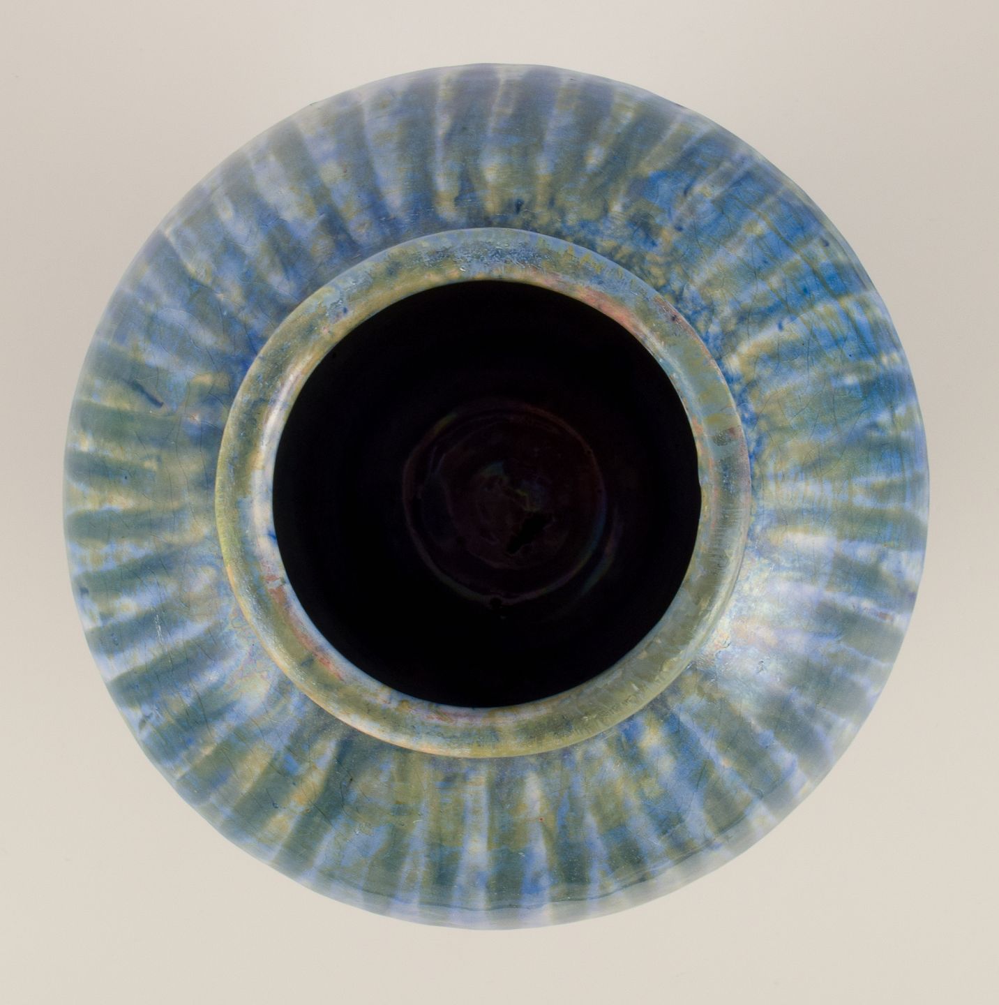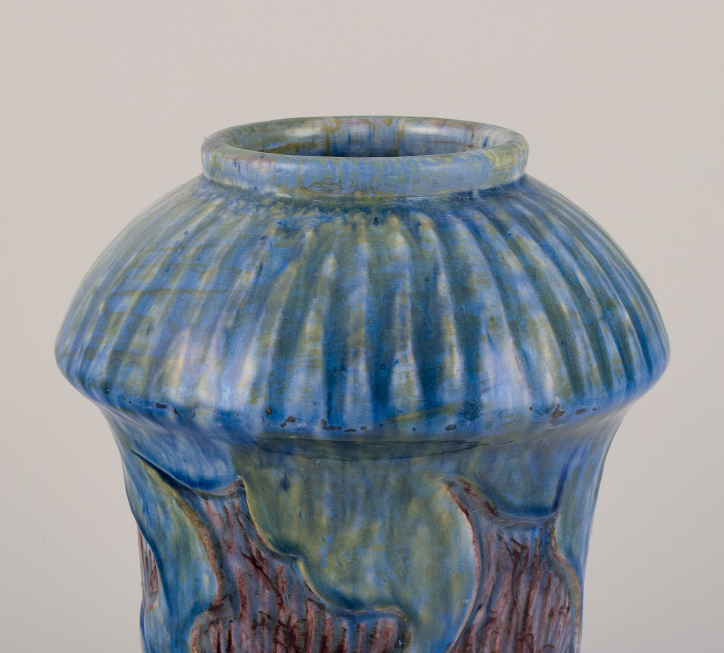 Møller & Bøgely, Danmark. Dansk skønvirke keramikvase i Bindesbøll stil. Glasur i blå og grønne toner.