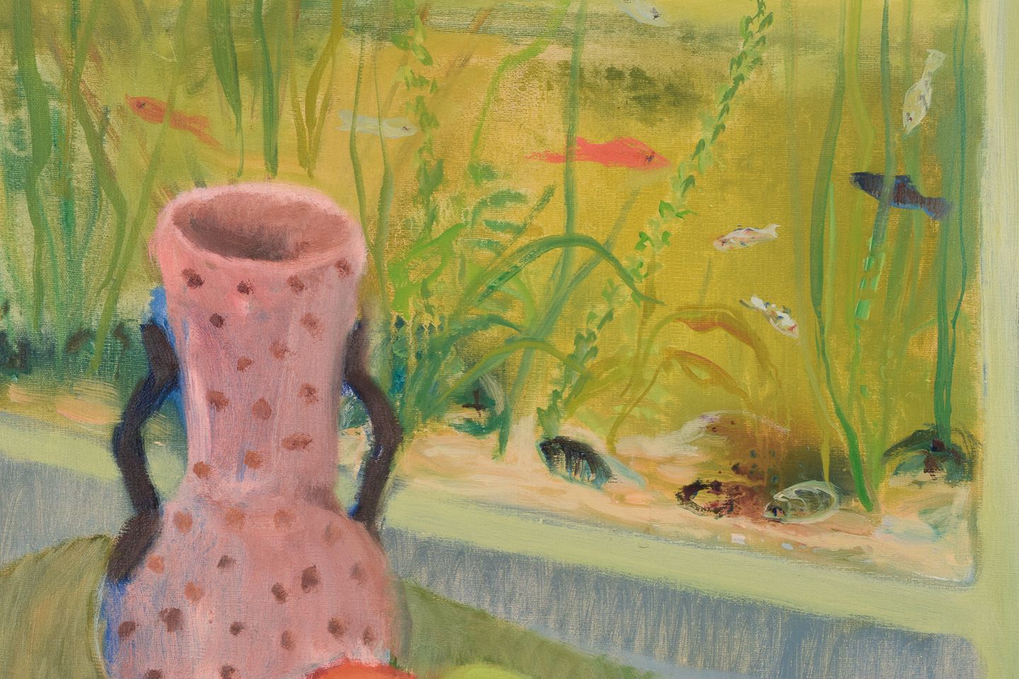 Einar Lindberg (1916-1993), svensk kunstner. Olie på lærred. Stilleben med akvarium, kande og frugter.