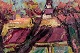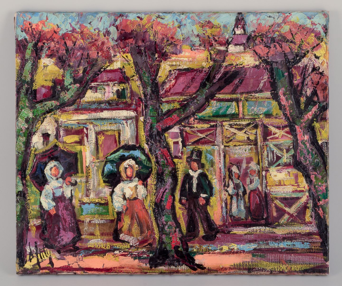 Henry Maurice D'Anty (1910-1998), svensk/fransk kunstner. Olie på lærred. Bymotiv med personer i forgrunden. Abstrakt stil.
