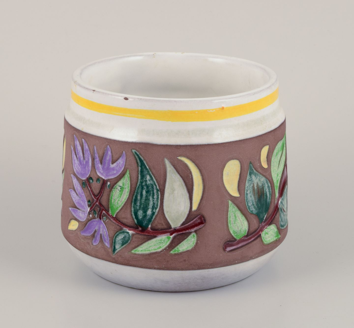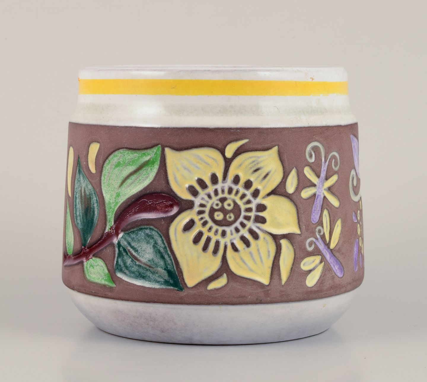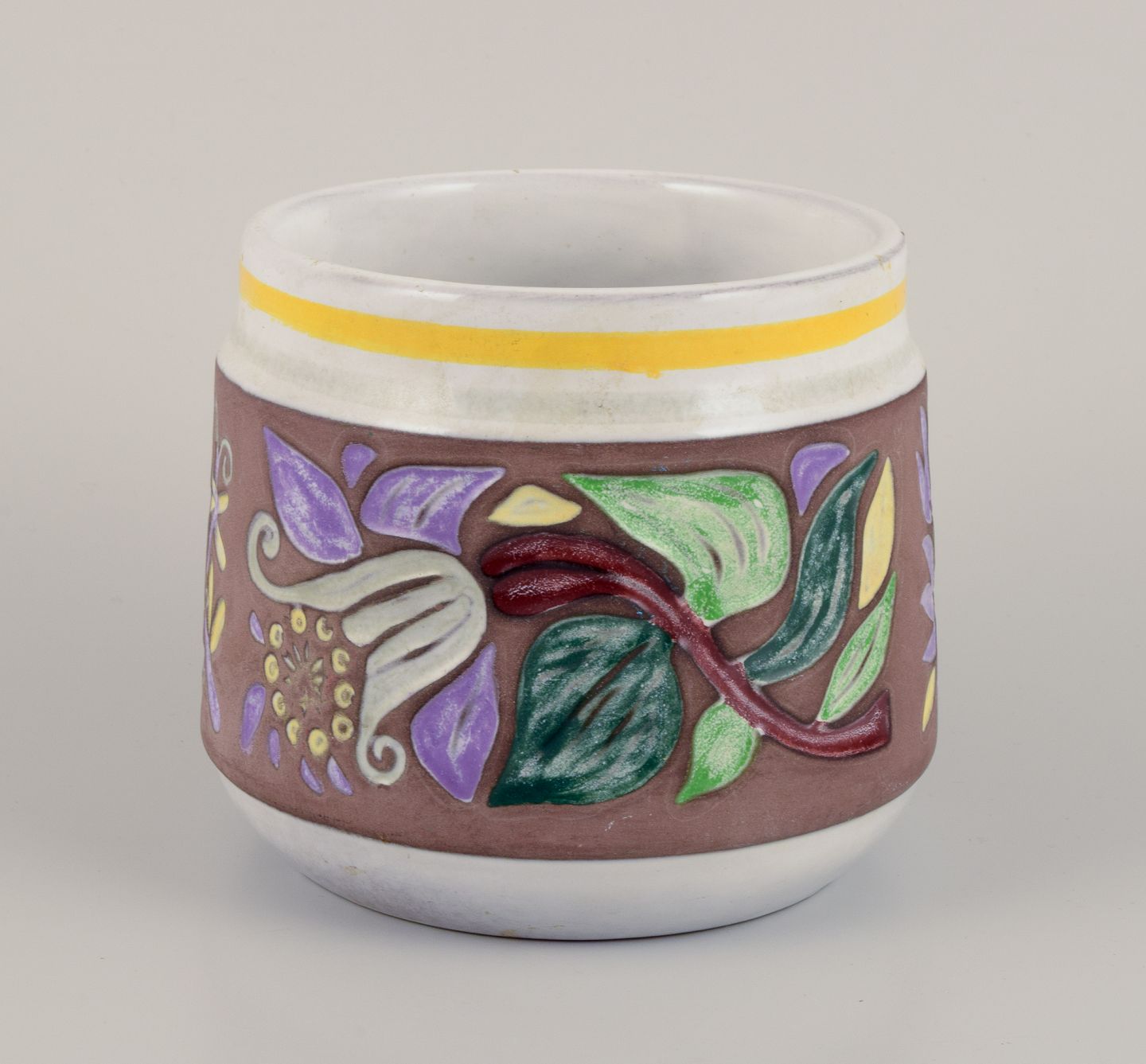 Mari Simmulson (1911-2000) for Upsala Ekeby. Urtepottekrukke i keramik. Polykrom glasur med blomstermotiver.