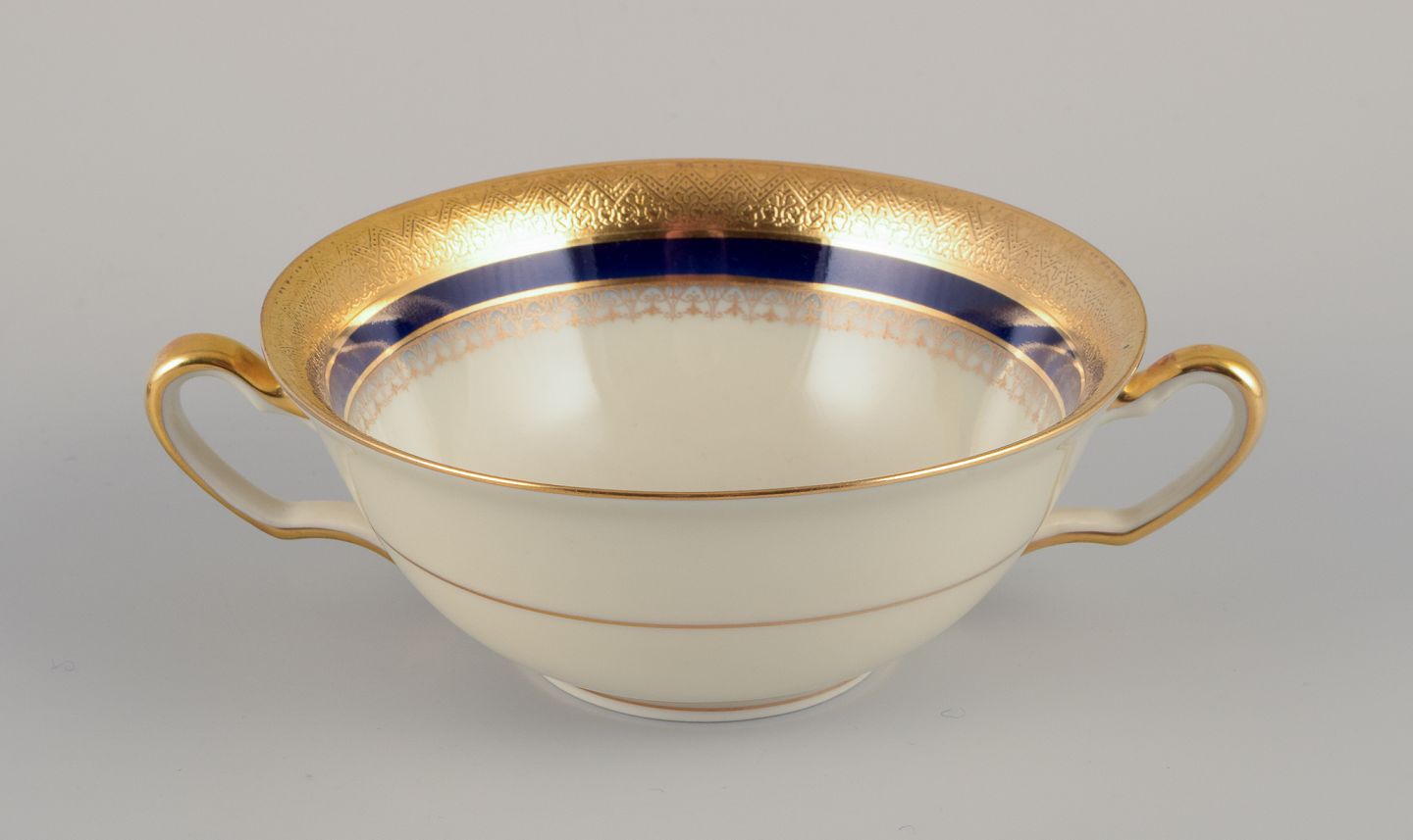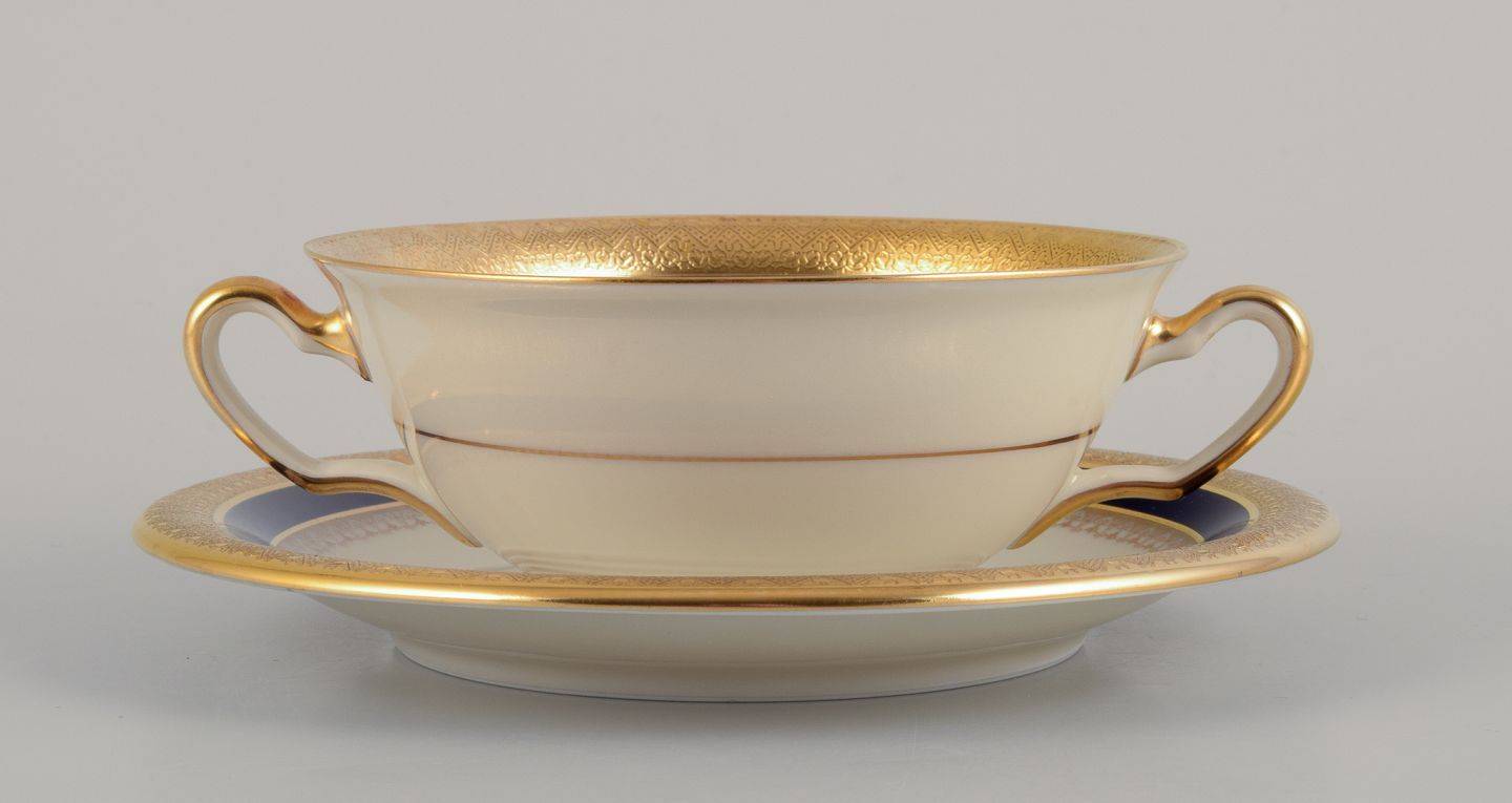 Hutschenreuther, Tyskland. Syv bouillonkopper og underkopper fra serien ”Margarete”. Hånddekoreret med guld og kongeblå.