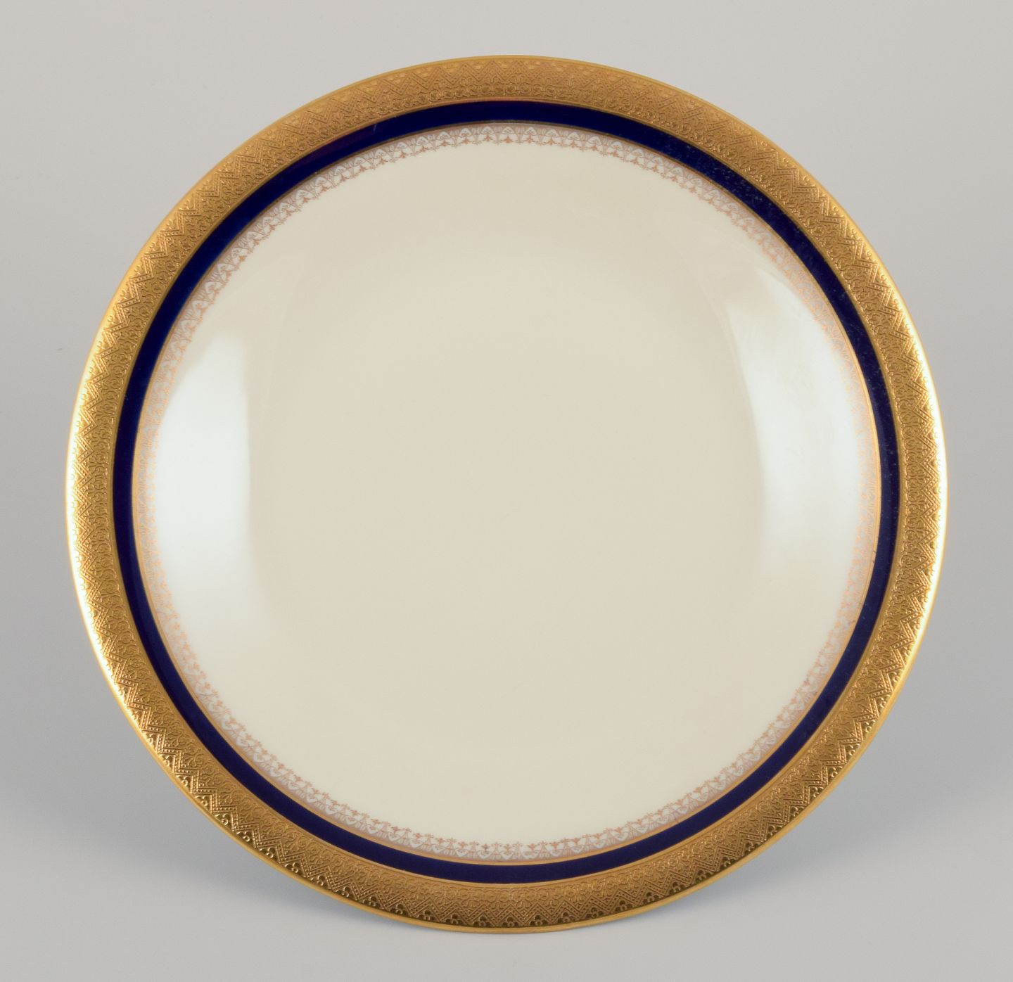 Hutschenreuther, Tyskland. Seks middagstallerkner fra serien ”Margarete”. Hånddekoreret med guld og kongeblå.
