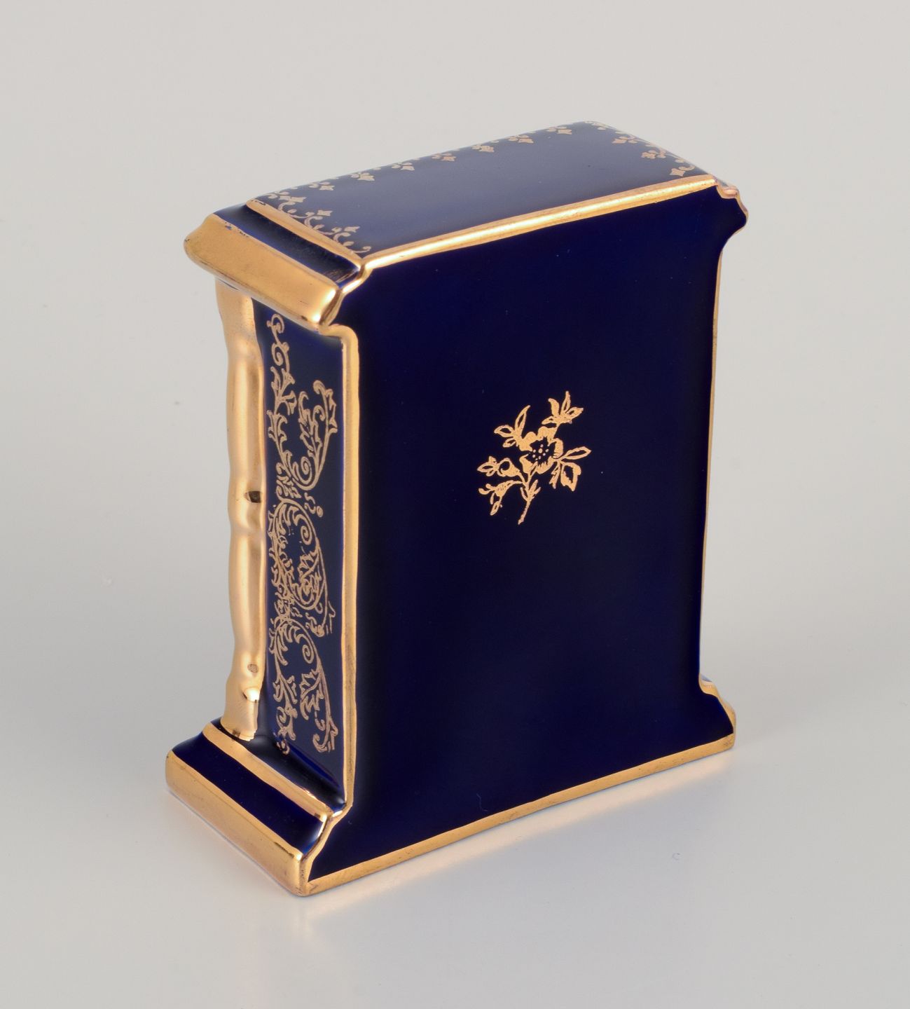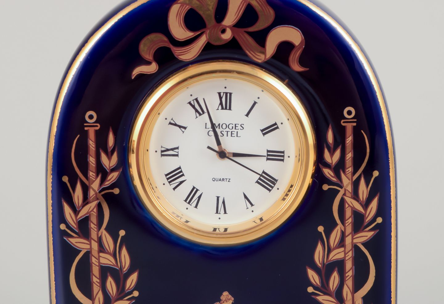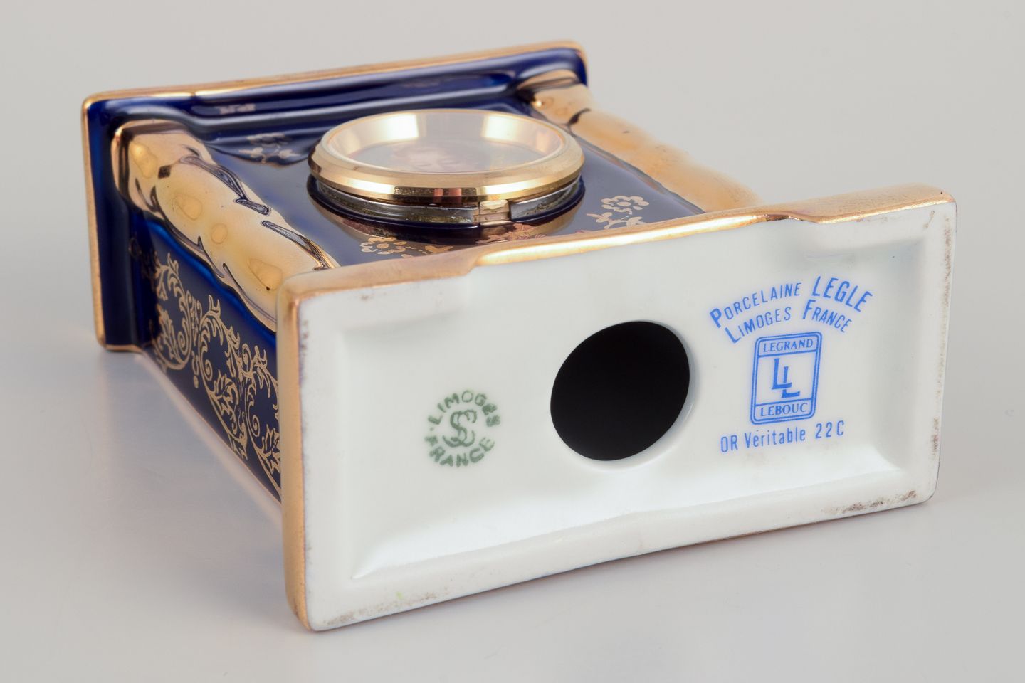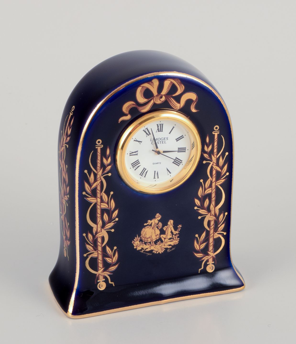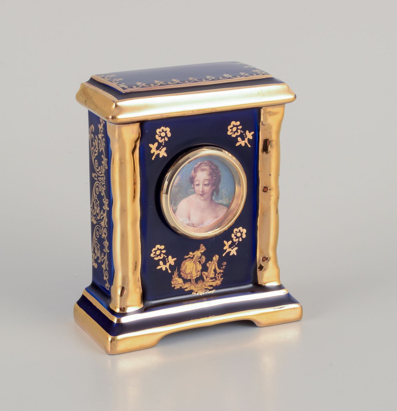Limoges, Frankrig. Ur og pyntegenstand i porcelæn. Dekoreret i 22-karat bladguld. Smuk kongeblå glasur. Scène galante.