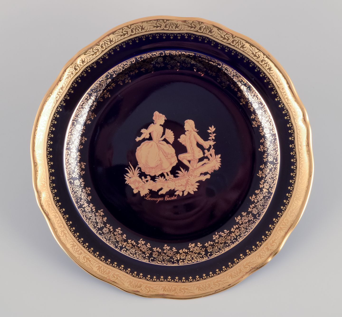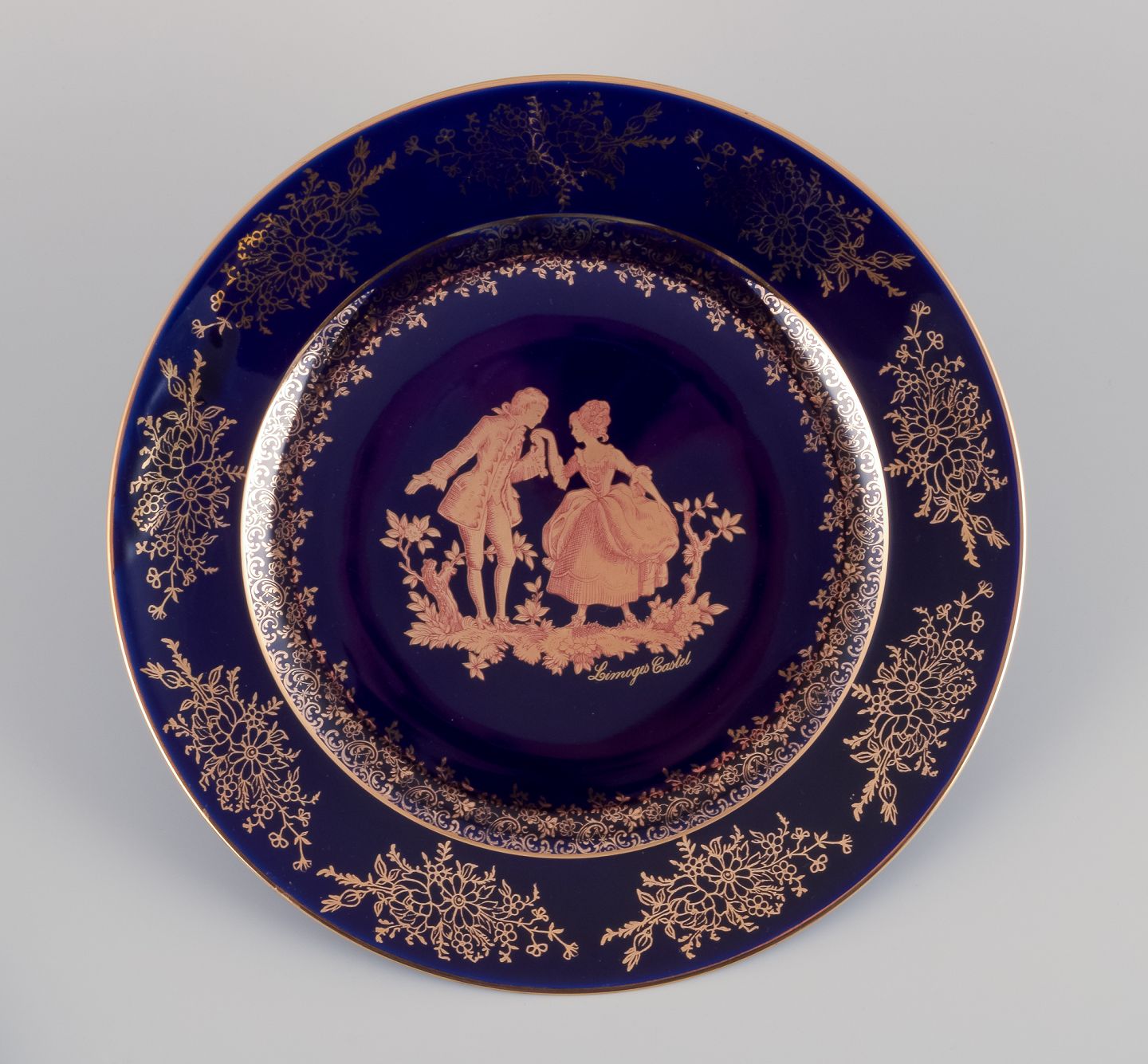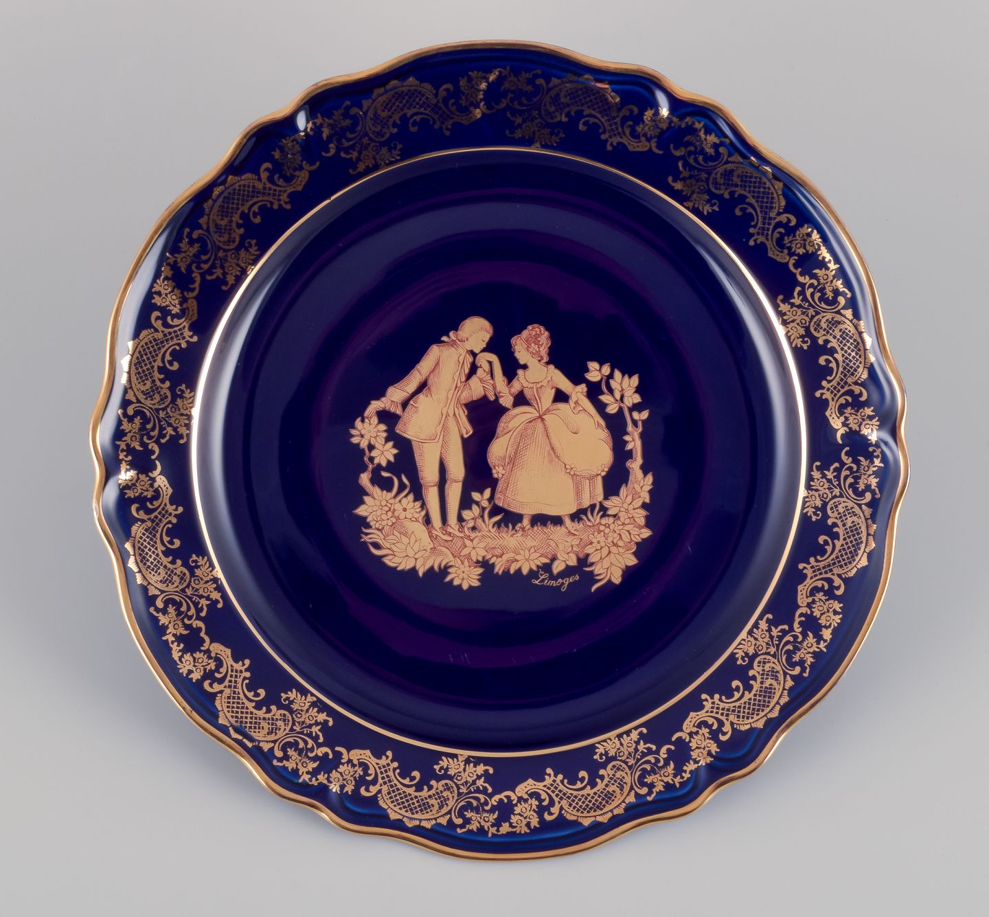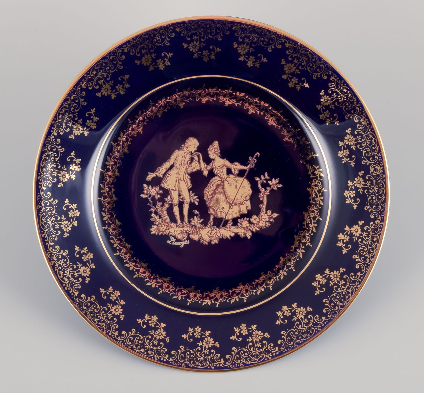 Limoges, Frankrig. Fire tallerkner i porcelæn dekoreret i 22-karat bladguld. Smuk kongeblå glasur. Scène galante.