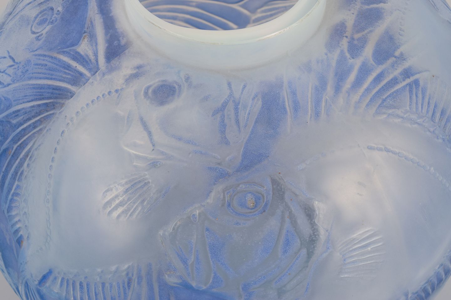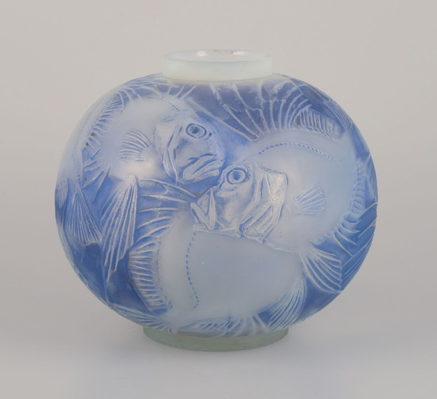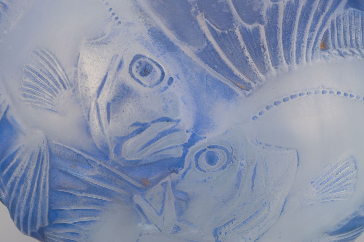 René Lalique (1860-1945). Stor, sjælden og tidlig ”Poissons” kunstglasvase i blåt glas.