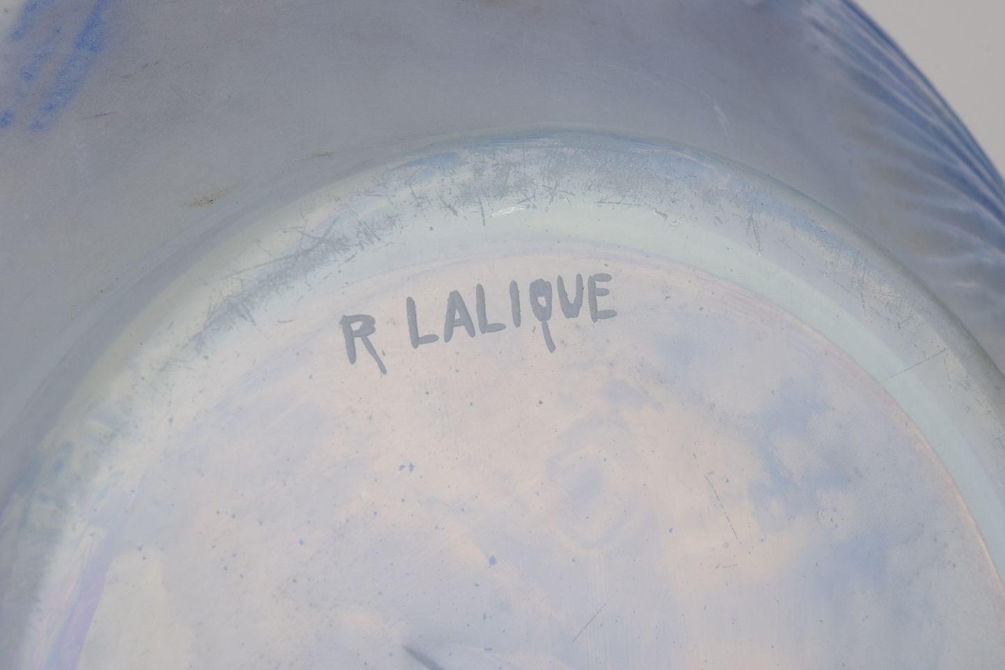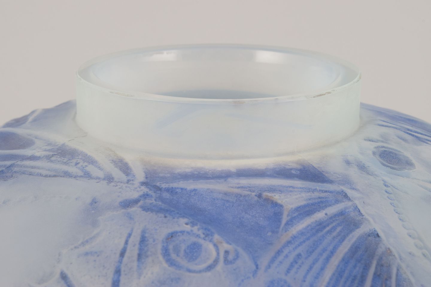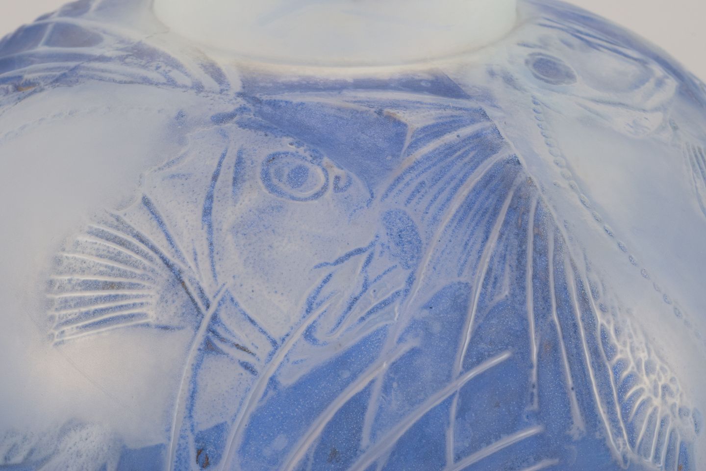 René Lalique (1860-1945). Stor, sjælden og tidlig ”Poissons” kunstglasvase i blåt glas.