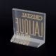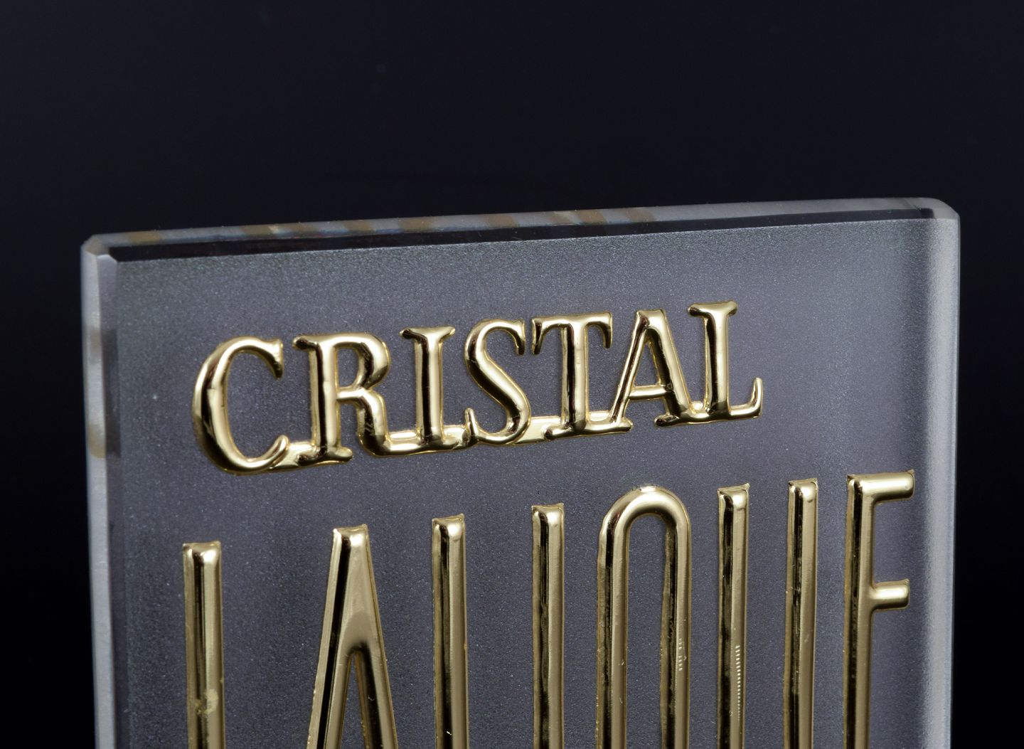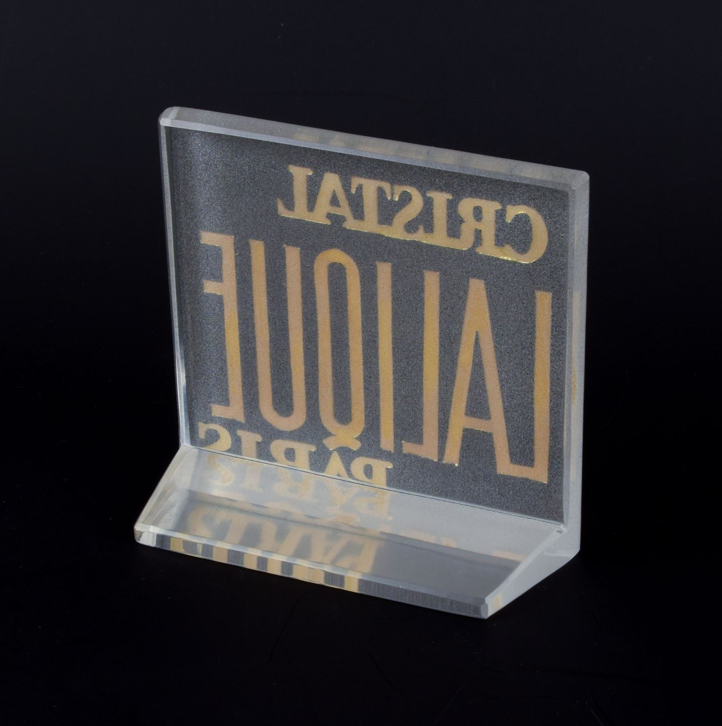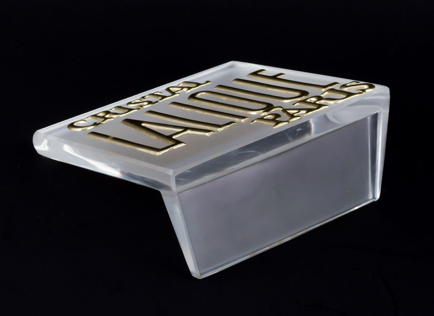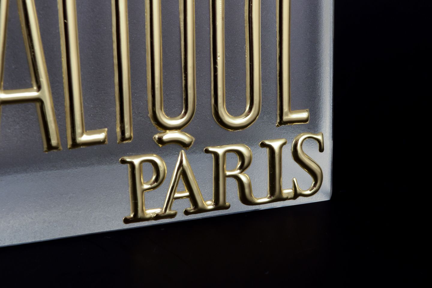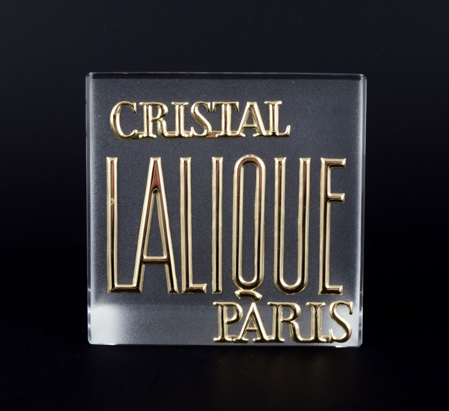 René Lalique (1860-1945), Frankrig. Udstillingsskilt/butiksskilt i delvist matteret glas. Tekst i guld. 1970/80’erne. Perfekt stand. Mĺl: B 9,5 cm. x H 9,5 cm. D 4.5 cm.