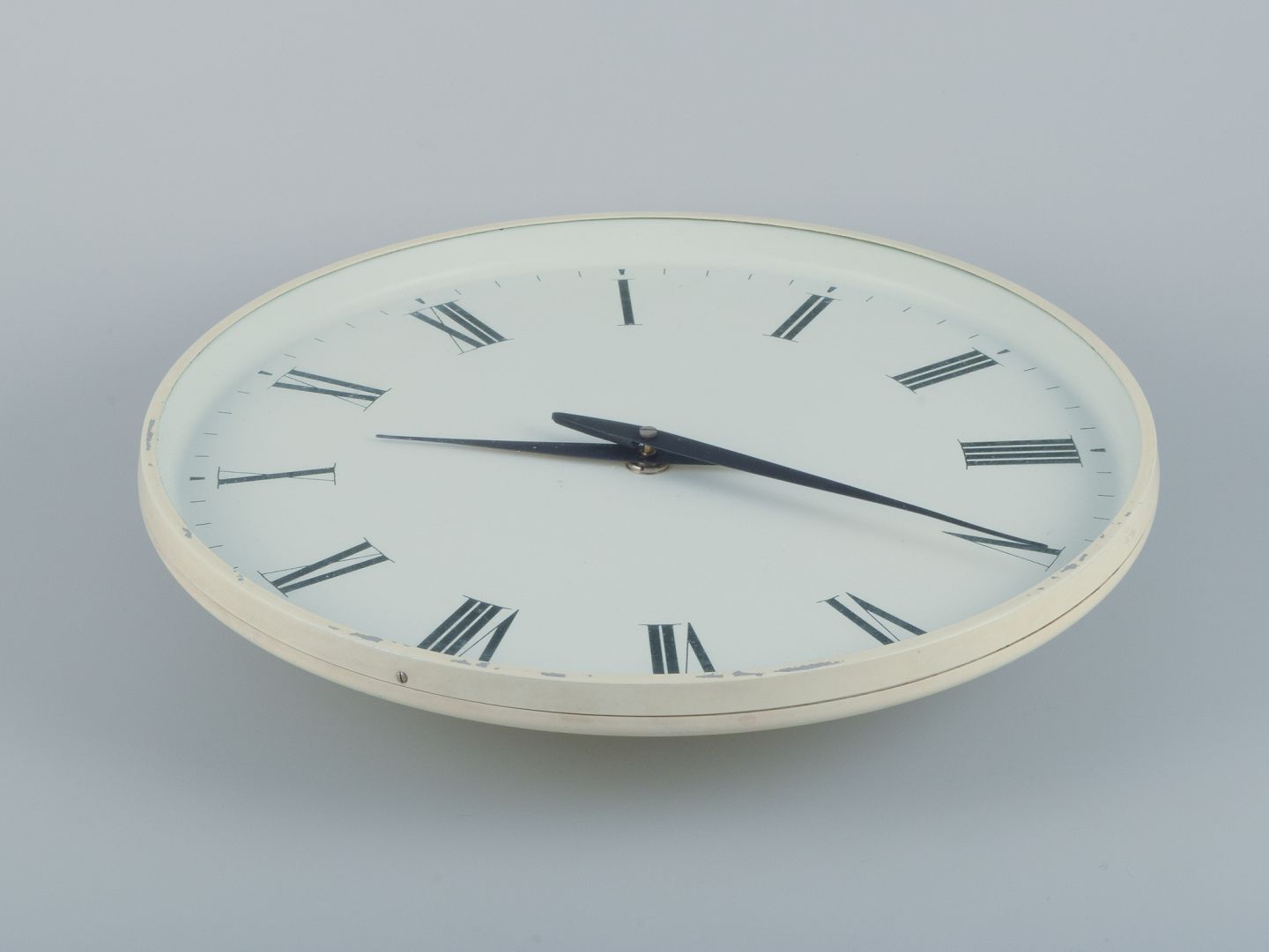 Henning Koppel for Georg Jensen. Vægur af hvid plast og metal. Urskive med romertal samt visere. 1960/70'erne. Diameter: 40 cm. I flot stand med brugspræg. D 39,5 cm. x D 8,0 cm.