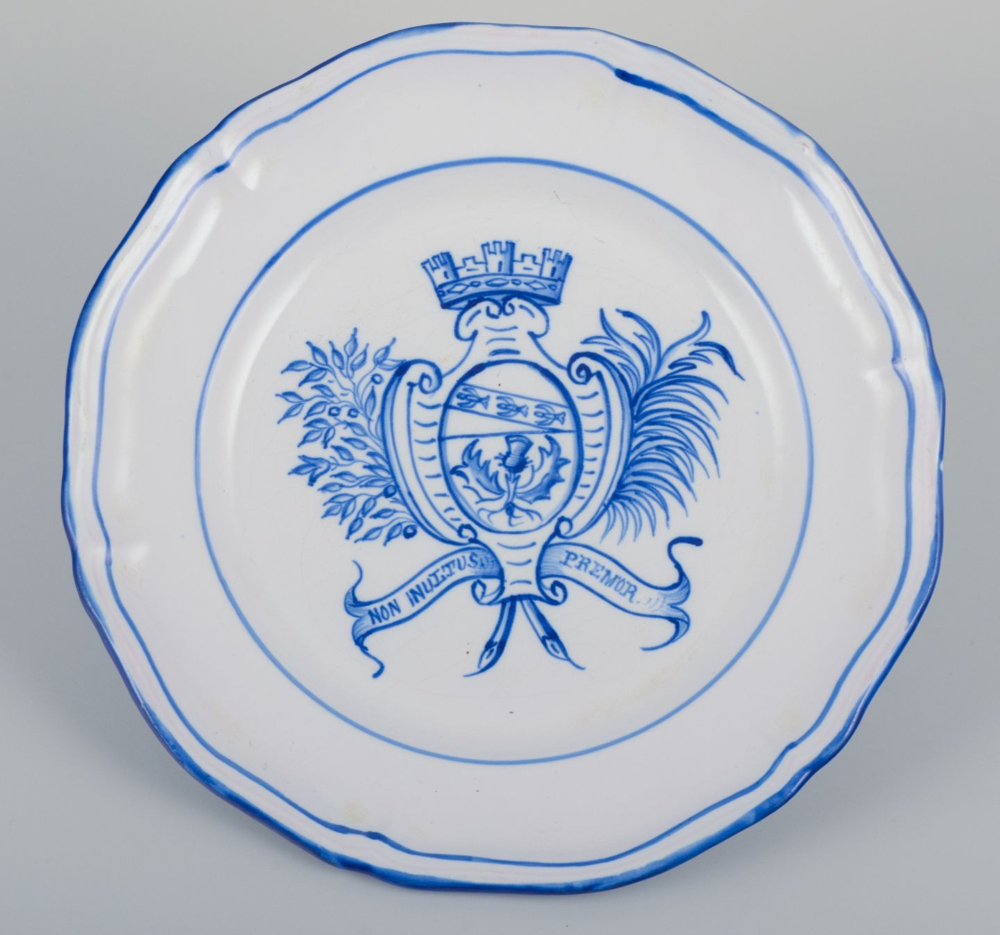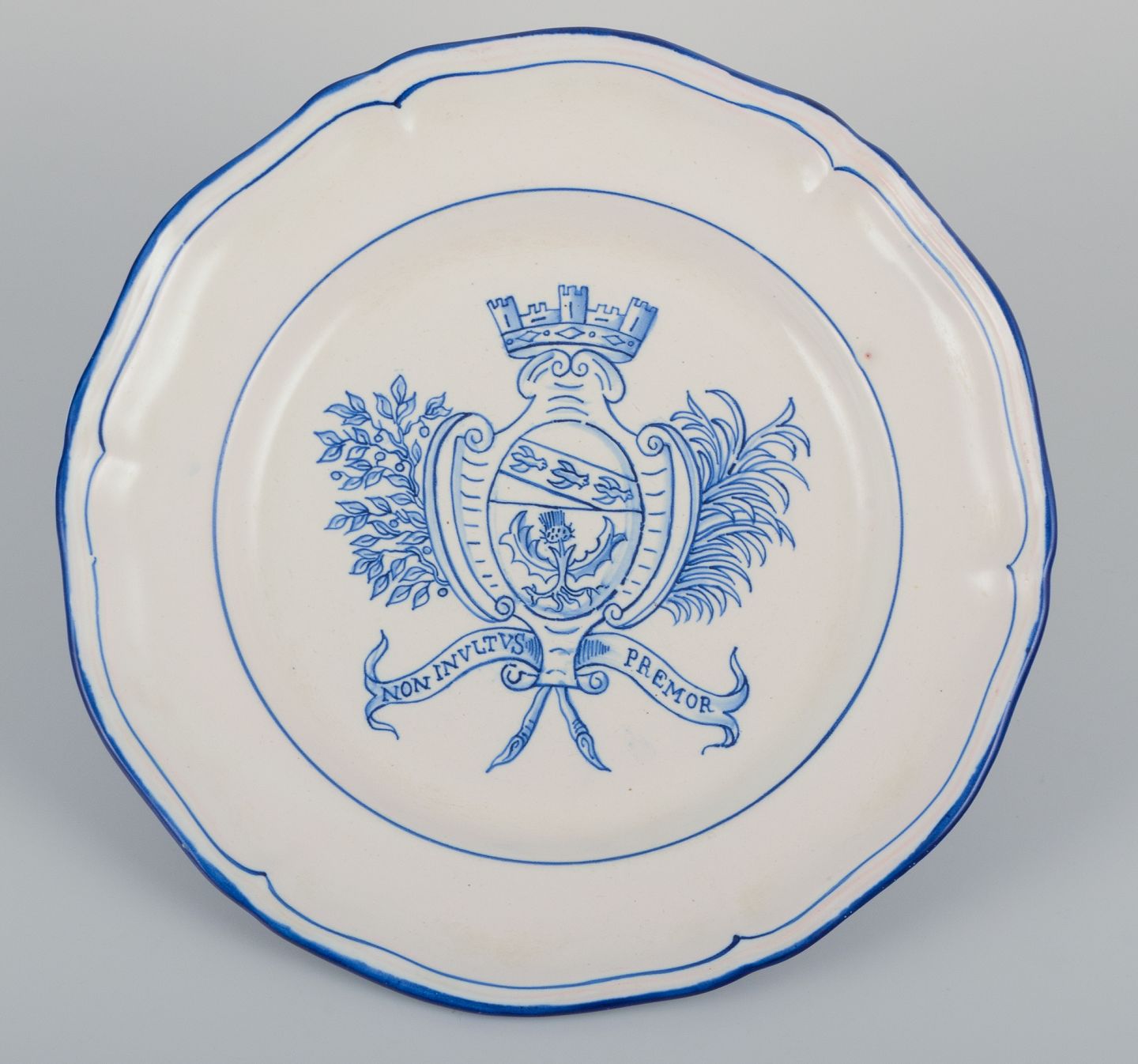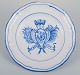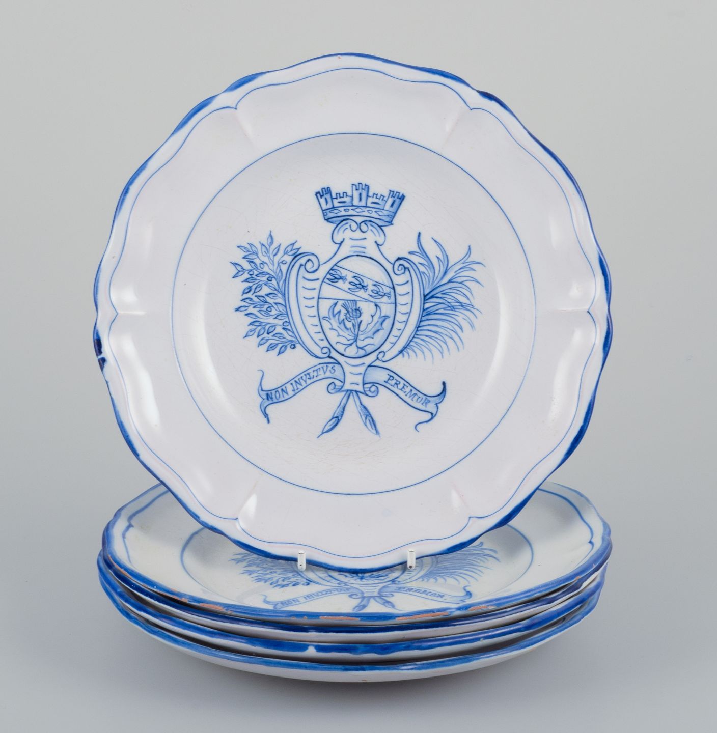 Emile Gallé for St. Clement, Nancy. A set of five dinner plates in hand-painted faience. Decorated with a coat of arms.