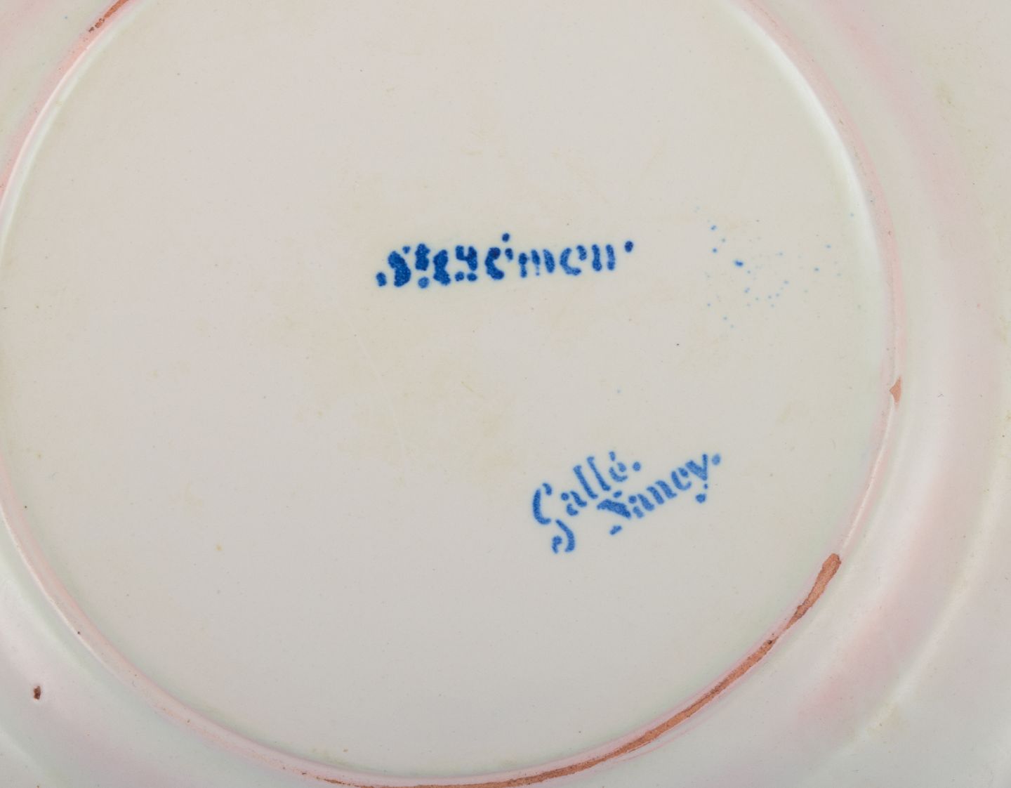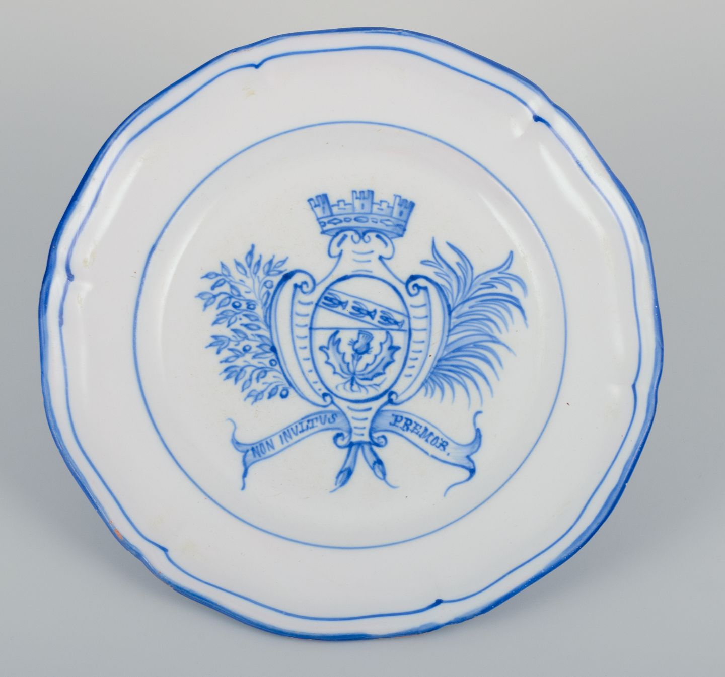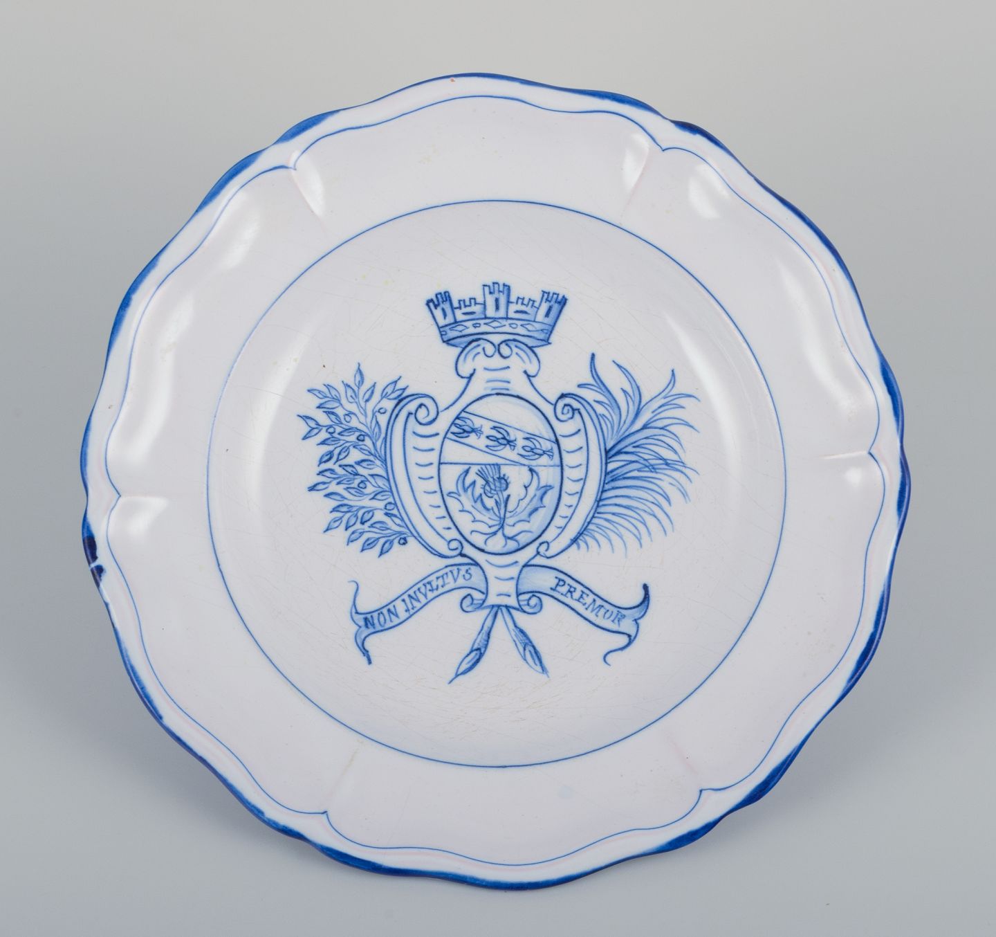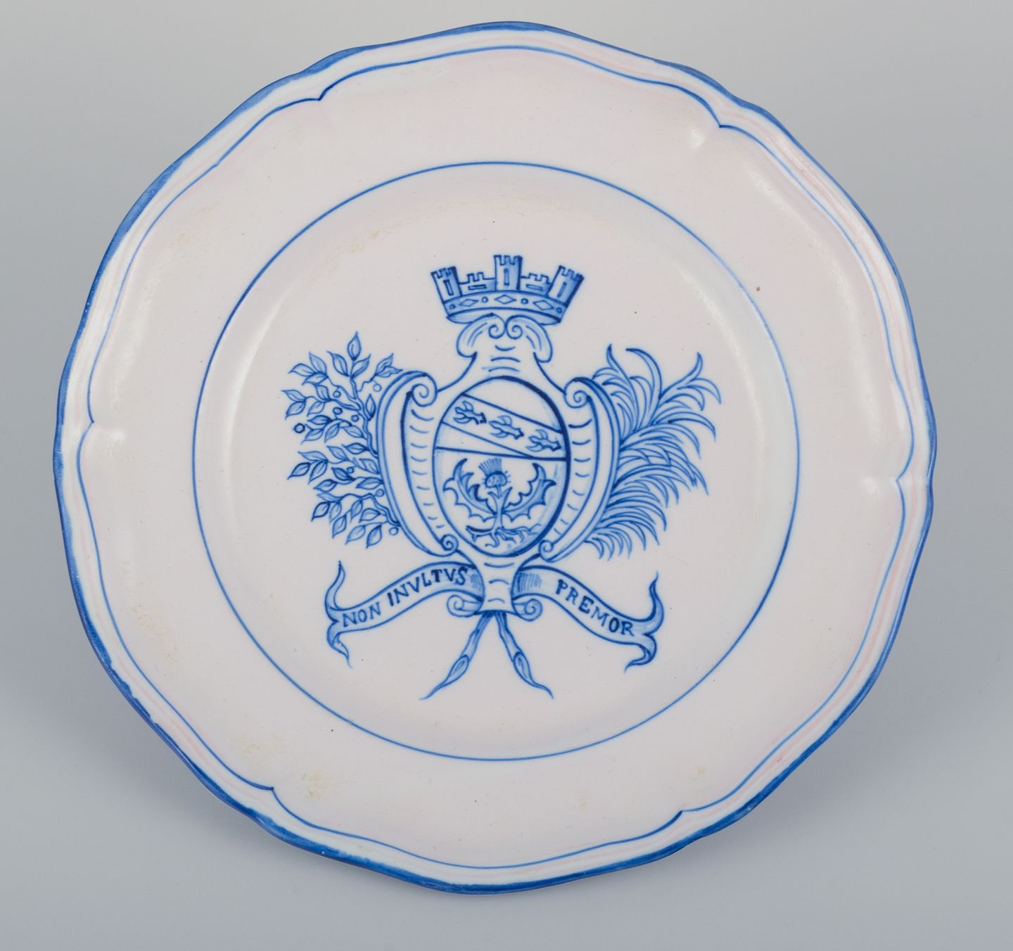 Emile Gallé for St. Clement, Nancy. A set of five dinner plates in hand-painted faience. Decorated with a coat of arms.