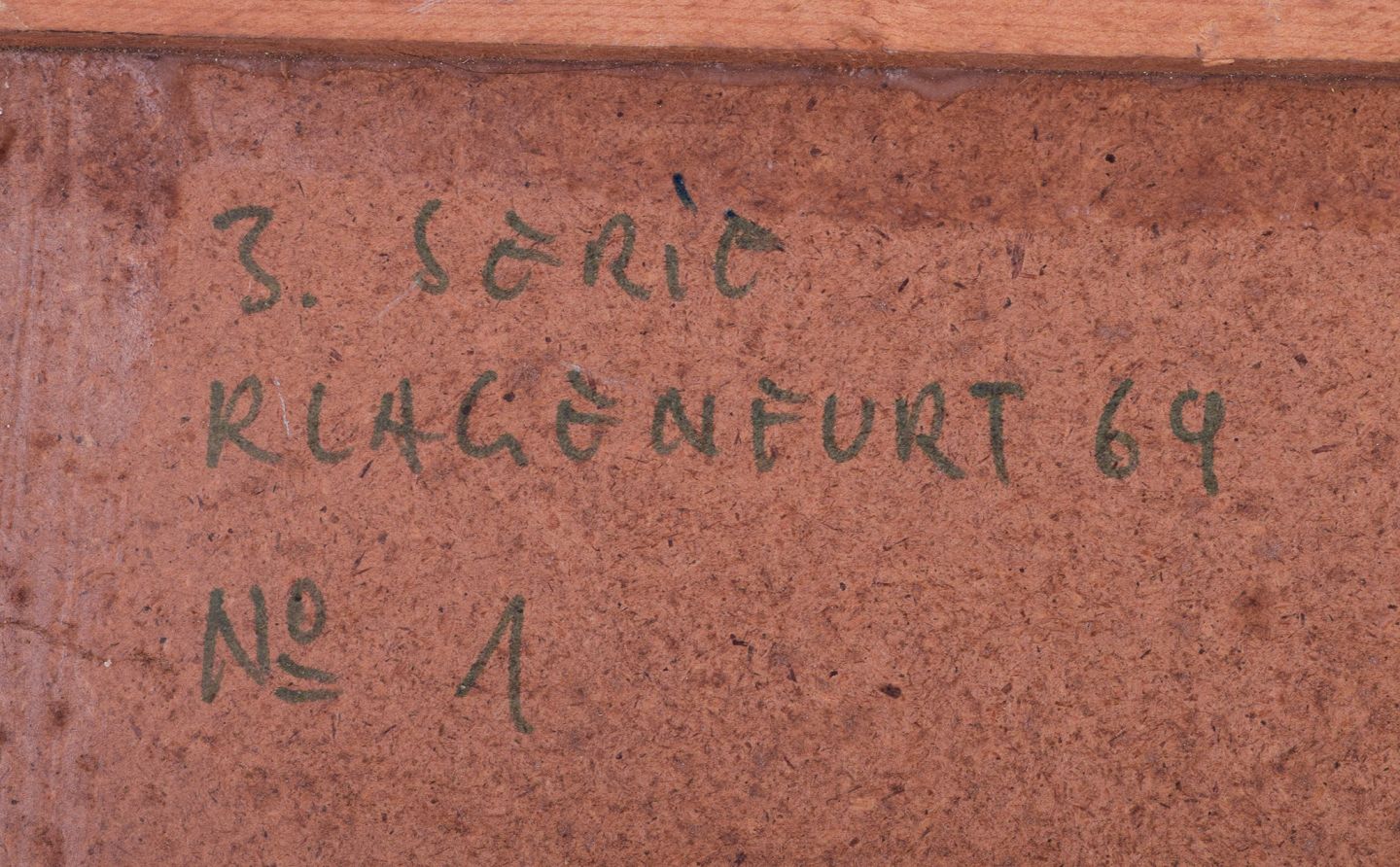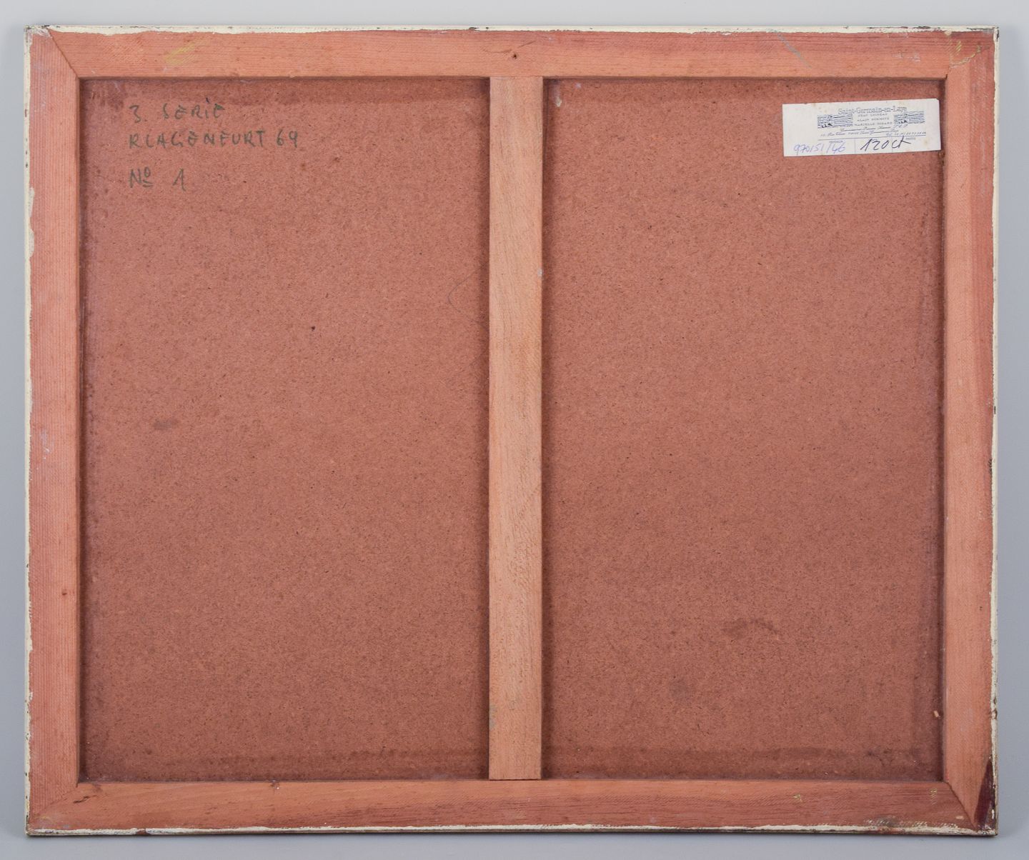 R. Wagner, europæisk kunstner. Olie på plade. Geometrisk komposition. Dateret 1970. Signeret og dateret på bagsiden. I flot stand. Kan med fordel renses. Mål: 65 cm. x 54 cm.