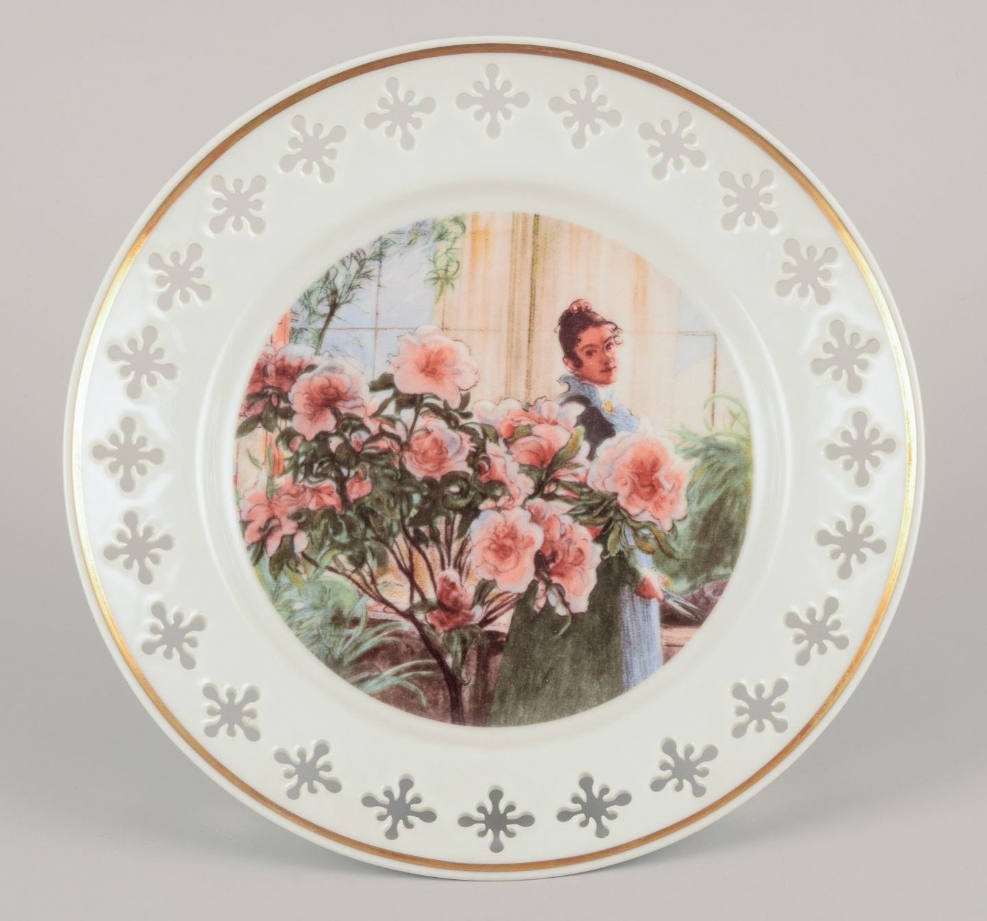 Bing og Grøndahl, Danmark. Et sæt på seks porcelænstallerkner, motiver fra Carl Larssons malerier. Gennembrudt kant.