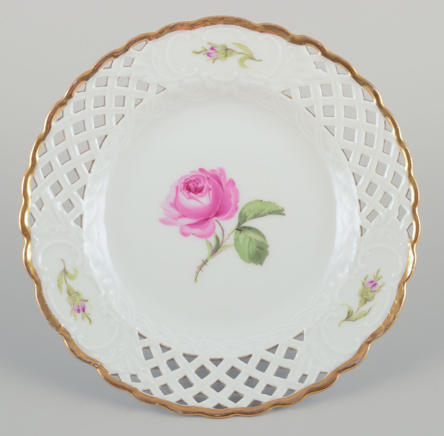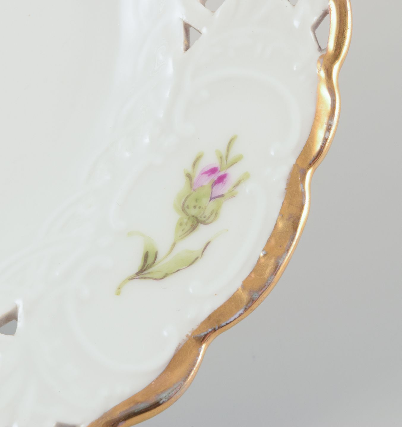 Håndmalet med lyserøde roser, guldkant.