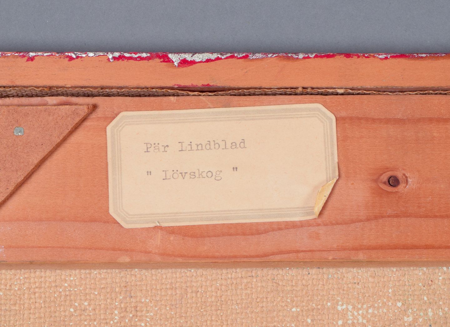 Pär Lindblad (1907-1981), svensk maler. Olie på lærred. Abstrakt komposition. Koloristisk palette. Titel: ”Lövskog”. Ca. 1960. Signeret. Mål: 91,5 cm. x 80,5 cm. Totalmål: 95,0 cm. x 83,0 cm.
