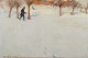 Vinterlandskab med gård i baggrunden og gående mand i sneen.