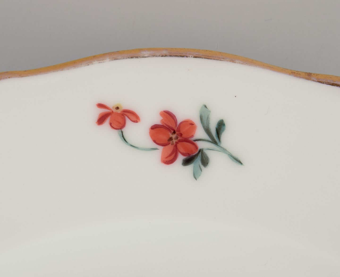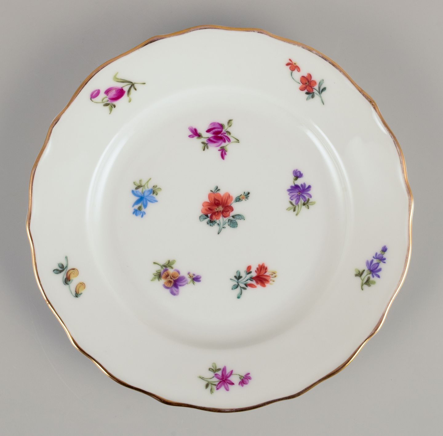 Otte tyske frokosttallerkner i porcelæn. Håndmalet med blomstermotiver i polykrome farver, guldkant. Ca. 1930. Stemplet ”Silesia”. I flot stand, med mindre slid i guldet. Mål: D 21,0 cm. x H 3,0 cm.