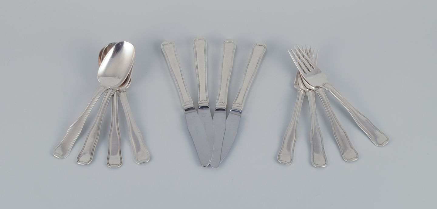 Bestående af fire frokostknive, fire frokostgafler samt fire dessertskeer.