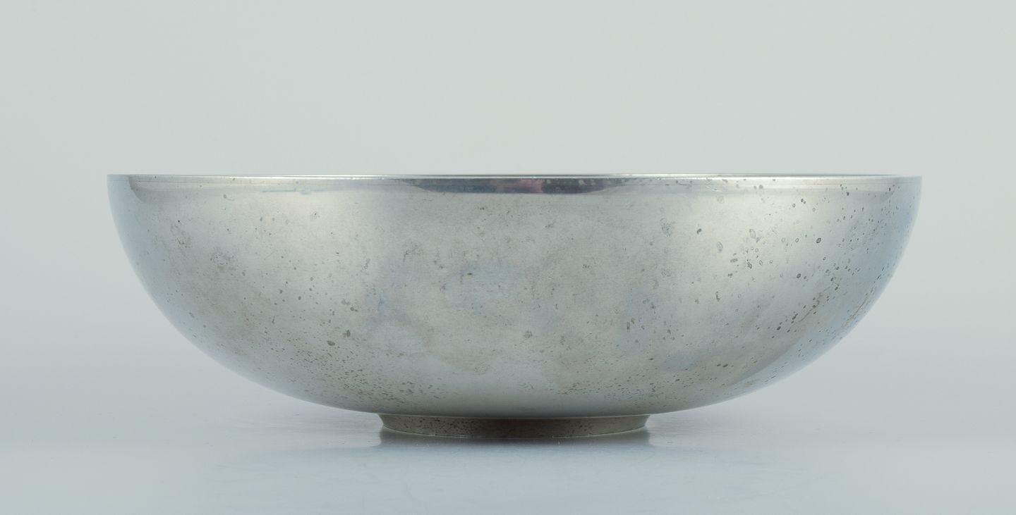 Henning Koppel for Georg Jensen, stor og sjælden skål i tin. Modernistisk design. Stilrent dansk design. 1960'erne. Stemplet. I flot stand med brugspræg. Mål: D 26,0 cm. x H 8,0 cm.