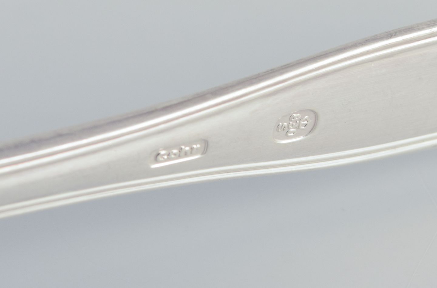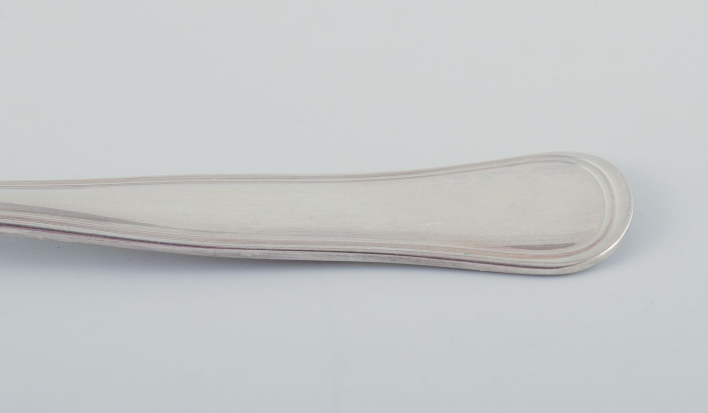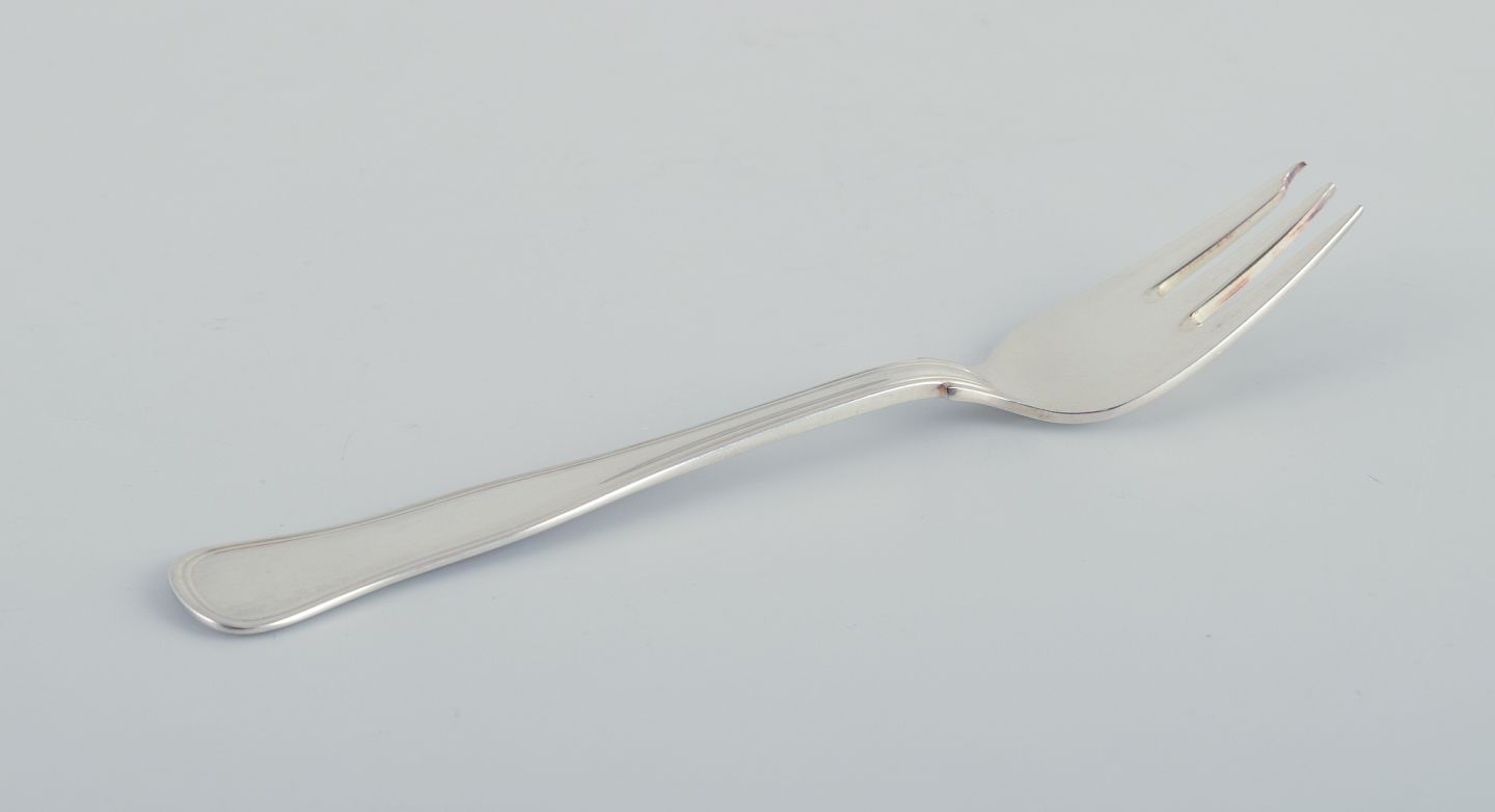 Cohr, dansk sølvsmed. Dobbeltriflet. Otte kagegafler i tretårnet sølv. Ca. 1940. Stemplet, en identisk gaffel med svenske sølvstempler. I perfekt stand. Mål: L 13,0 cm.