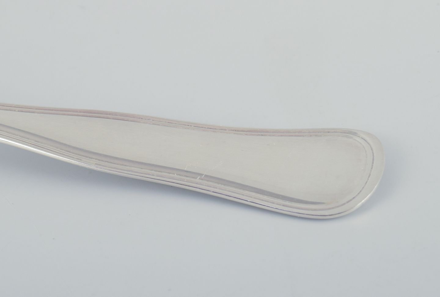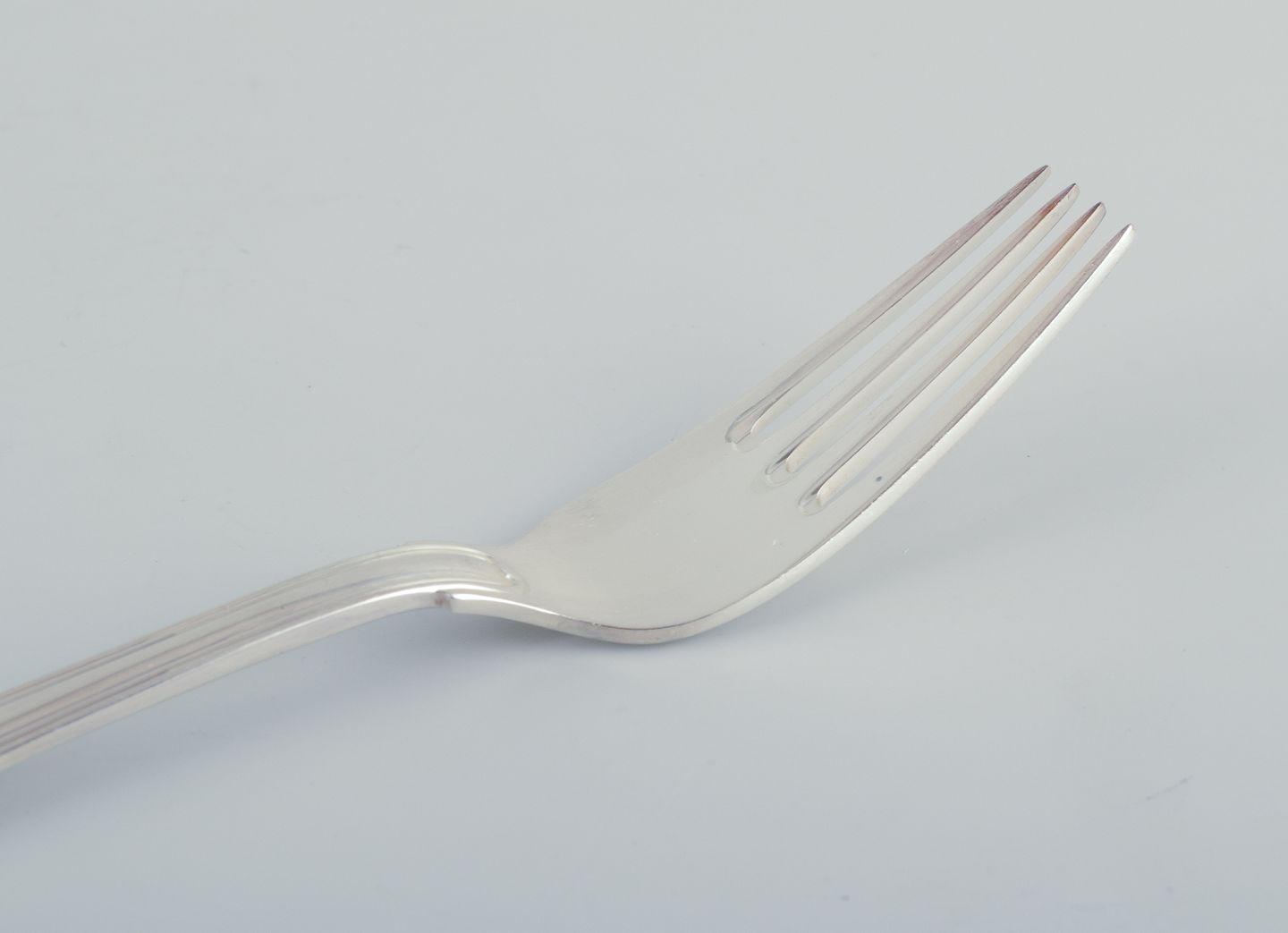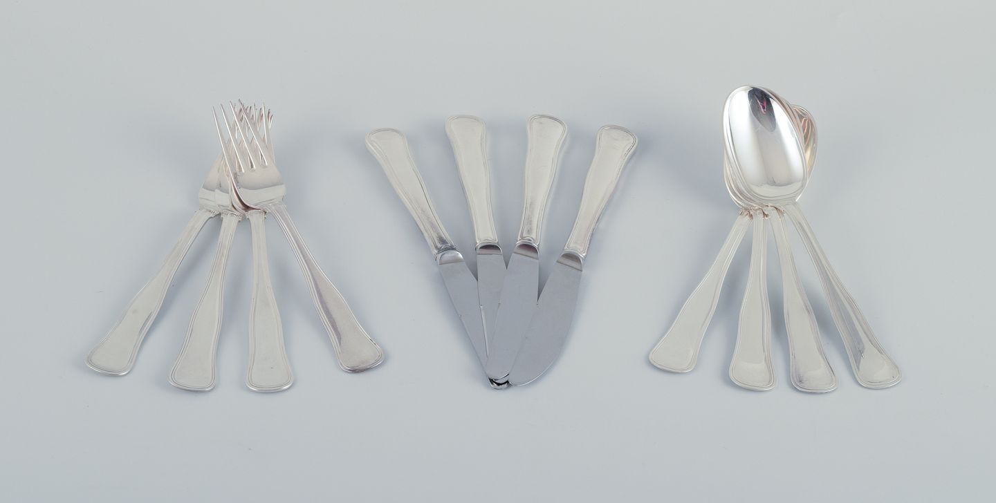Cohr, dansk sølvsmed. Dobbeltriflet. Komplet firepersoners frokostservice bestående af fire frokostknive, fire frokostgafler og fire skeer i tretårnet sølv.