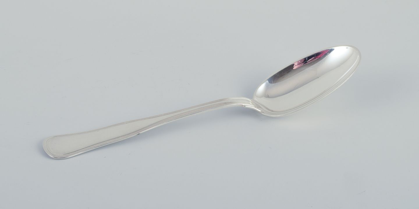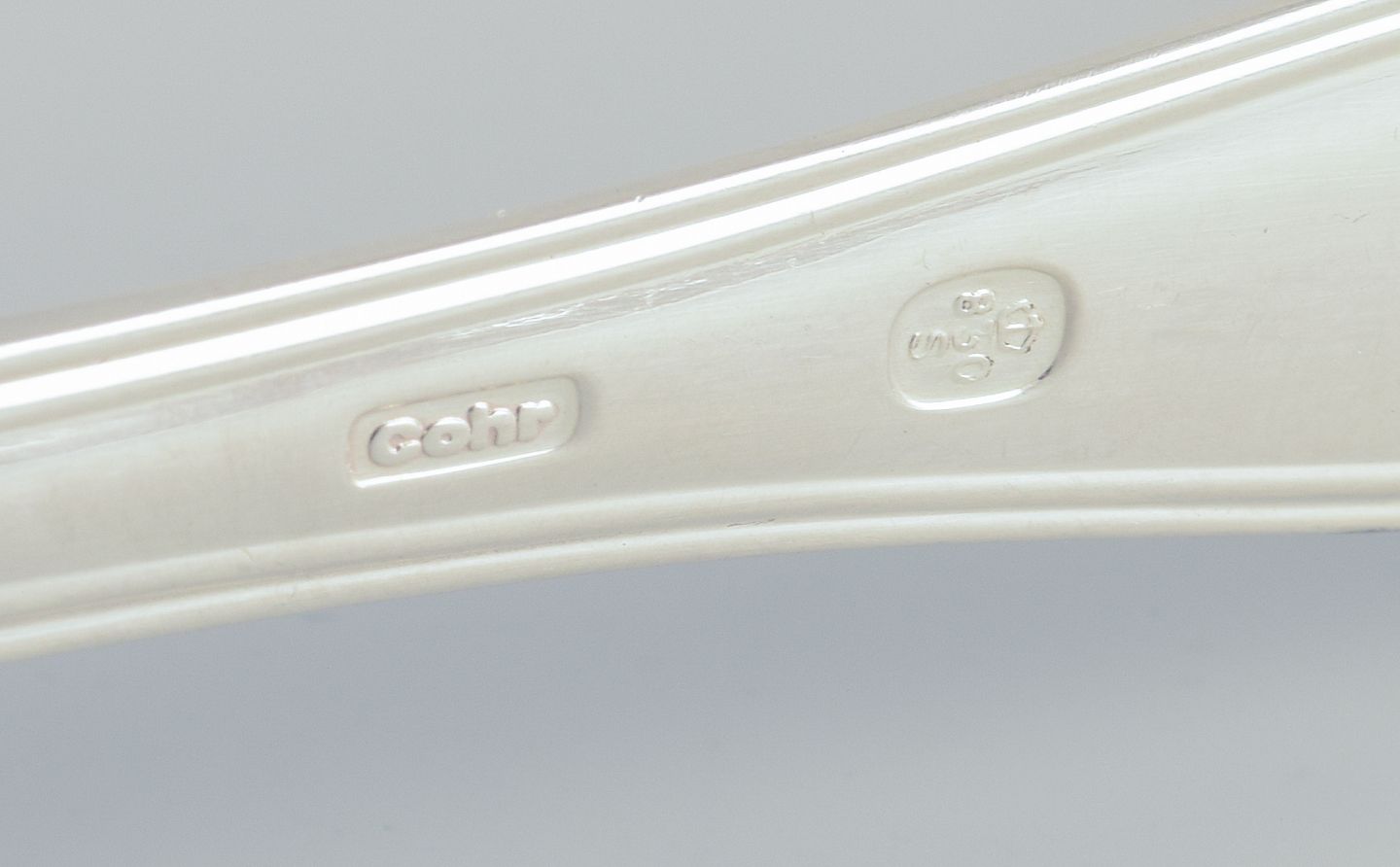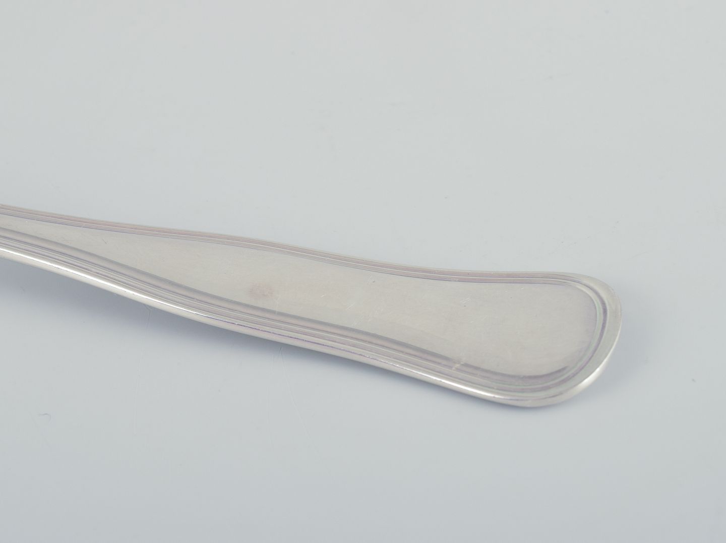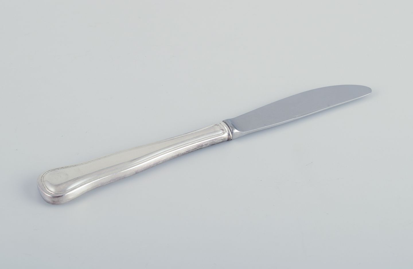 Cohr, dansk sølvsmed. Dobbeltriflet. Komplet firepersoners frokostservice bestående af fire frokostknive, fire frokostgafler og fire skeer i tretårnet sølv.