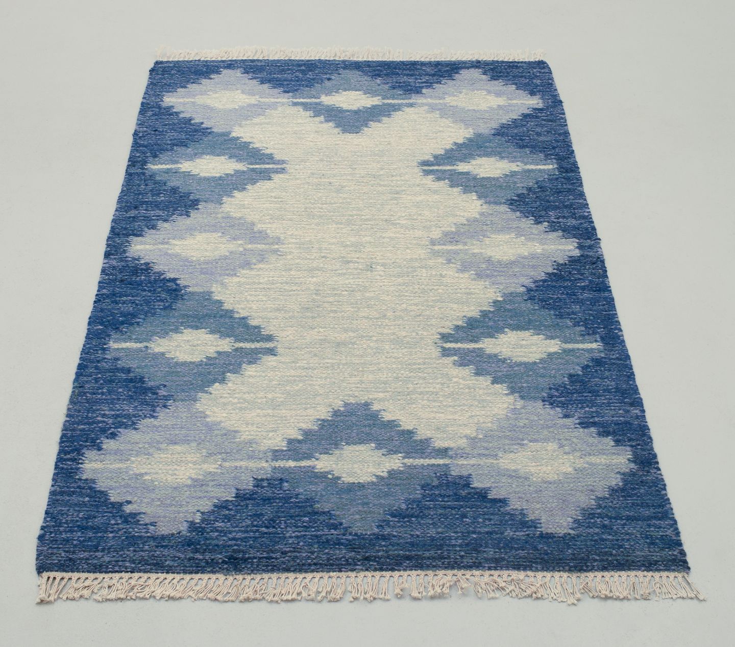 Svensk tekstildesigner. Håndvævet tæppe i ren uld. Rölakan-teknik. Geometrisk mønster. Grå og blå farver. Midt 1900-tallet. I flot stand med minimalt brugspræg. Mål: 214 cm. x 139 cm. inklusive frynser.