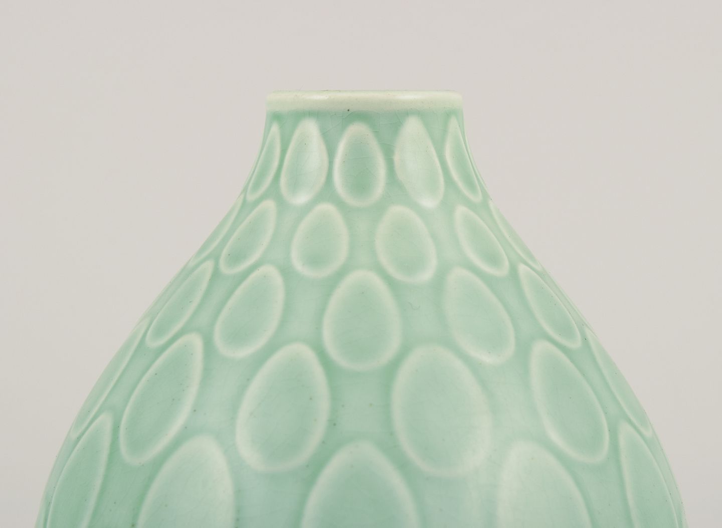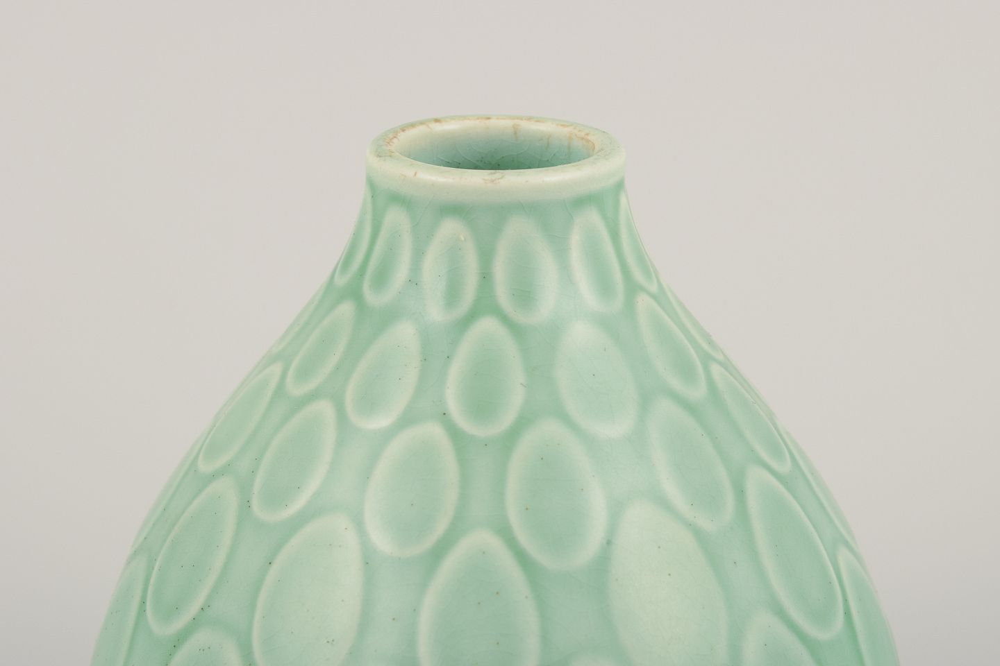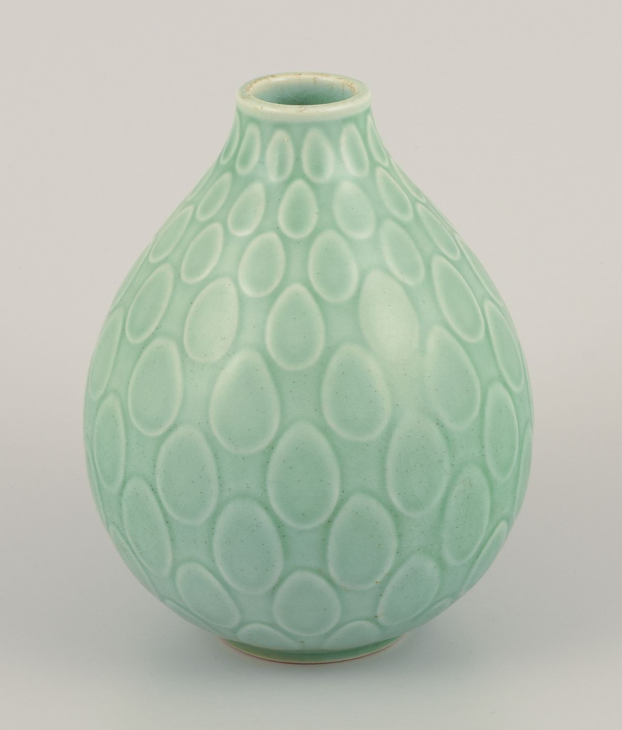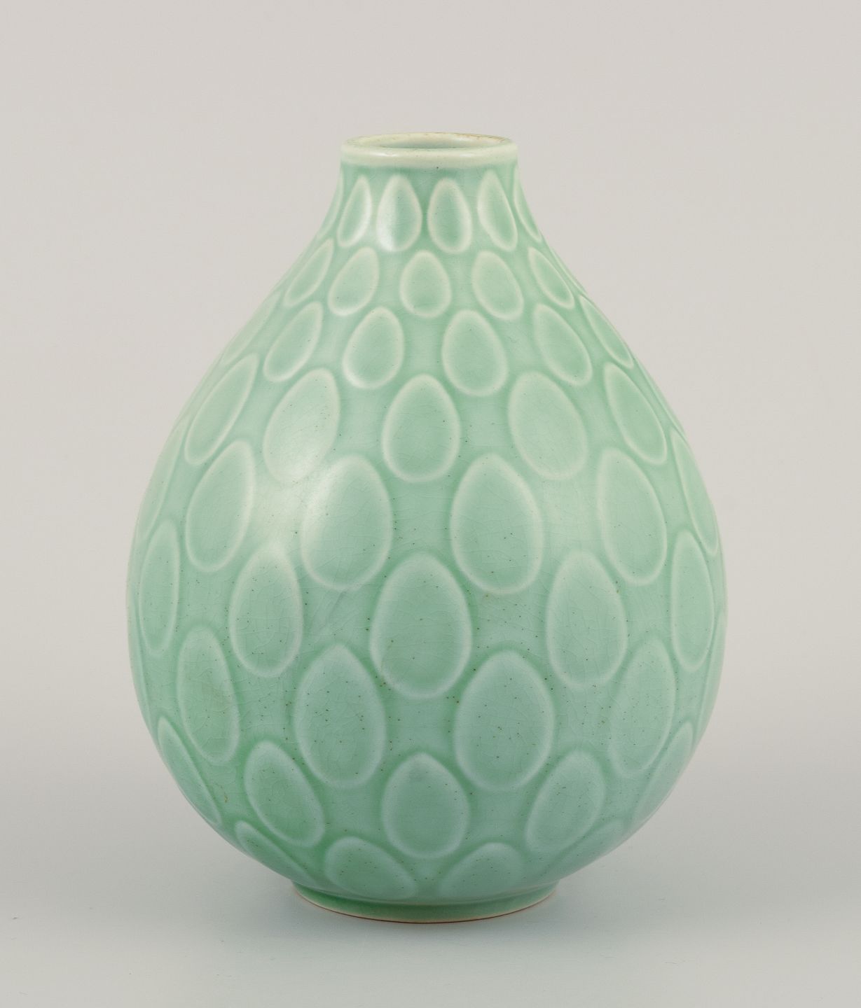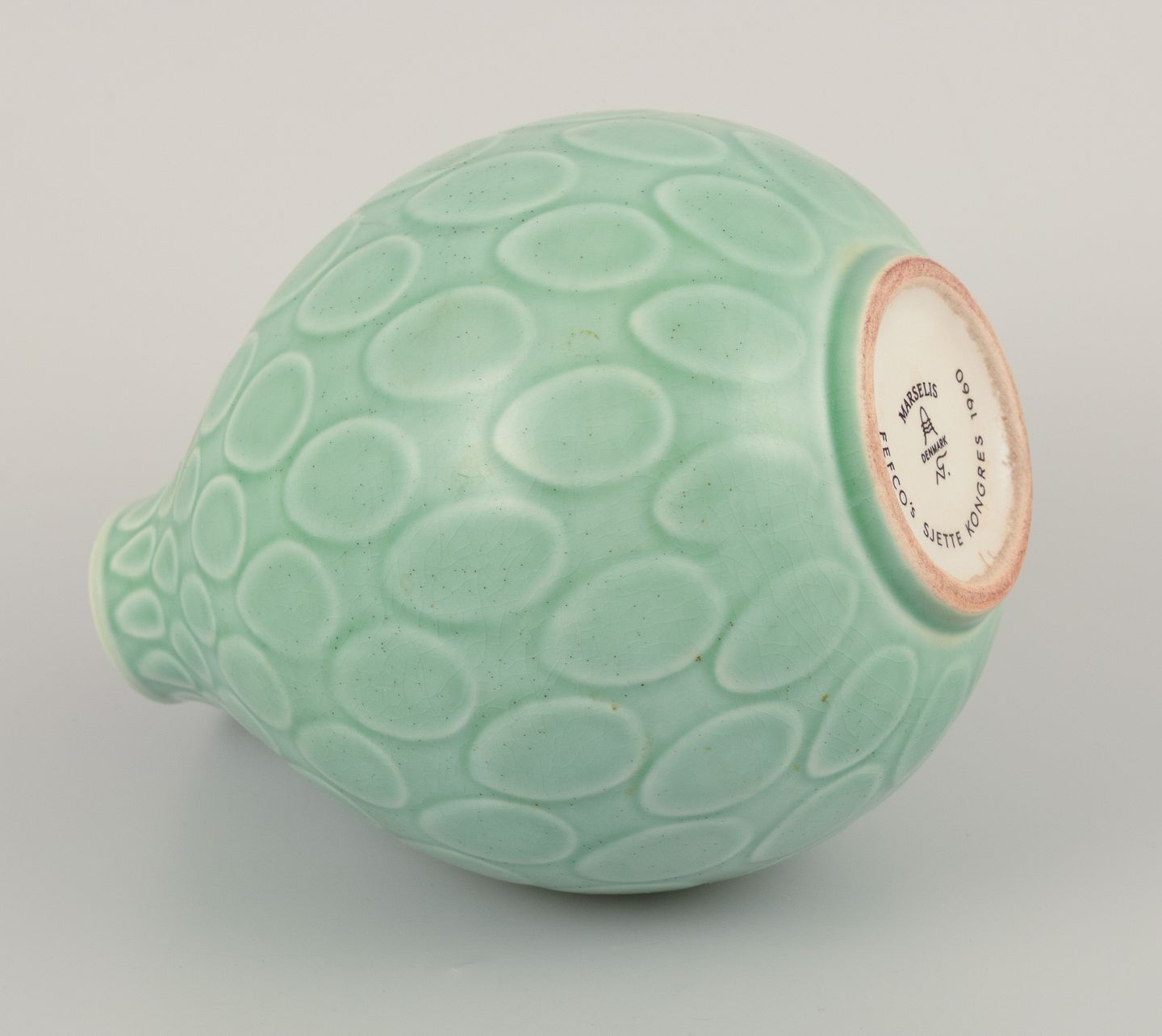 Nils Thorsson (1898-1975) for Aluminia. "Marselis" vase i glaseret fajance. Smuk glasur i grønne nuancer. Dateret 1960. I flot stand. Stemplet. Første sortering. Mål: H 13,5 cm. x D 10,0 cm.