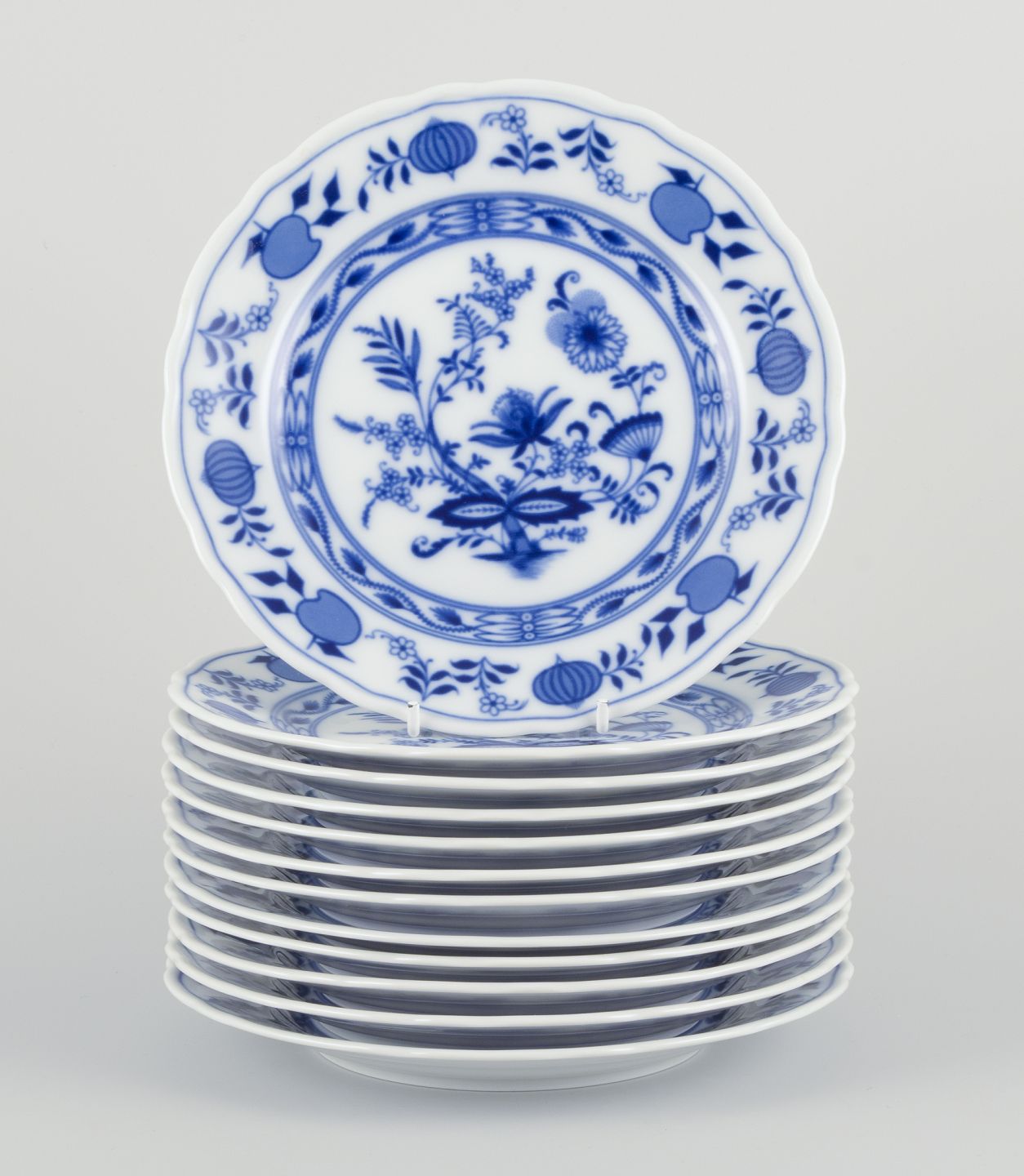 Bavaria, Germany. A set of twelve porcelain plates, Blue Onion pattern. Dating: Mid 20th century. Marked. Perfect condition. Appears unused. Dimensions: D 20.0 cm.