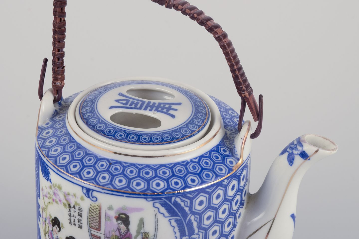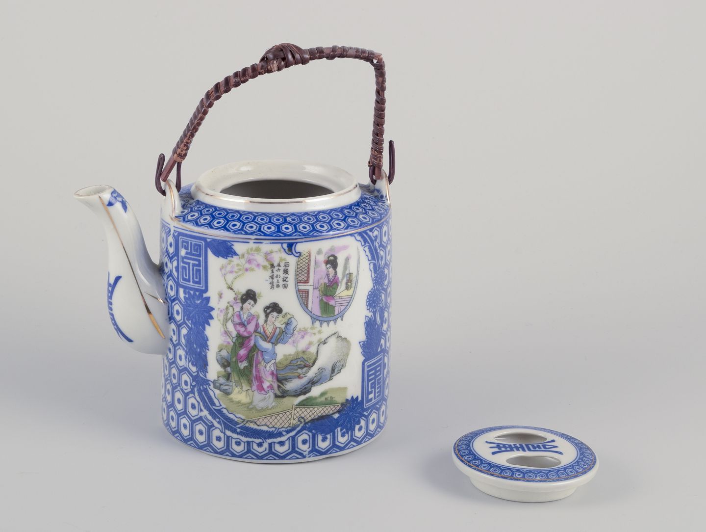 Kinesisk tekande af porcelæn. Bambushank. Håndmalet motiv af kvinder i landskab. Ca. 1930. Perfekt stand. Stemplet. Mål: B 14,0 cm. med tud x H 12,0 cm. (uden hank)