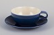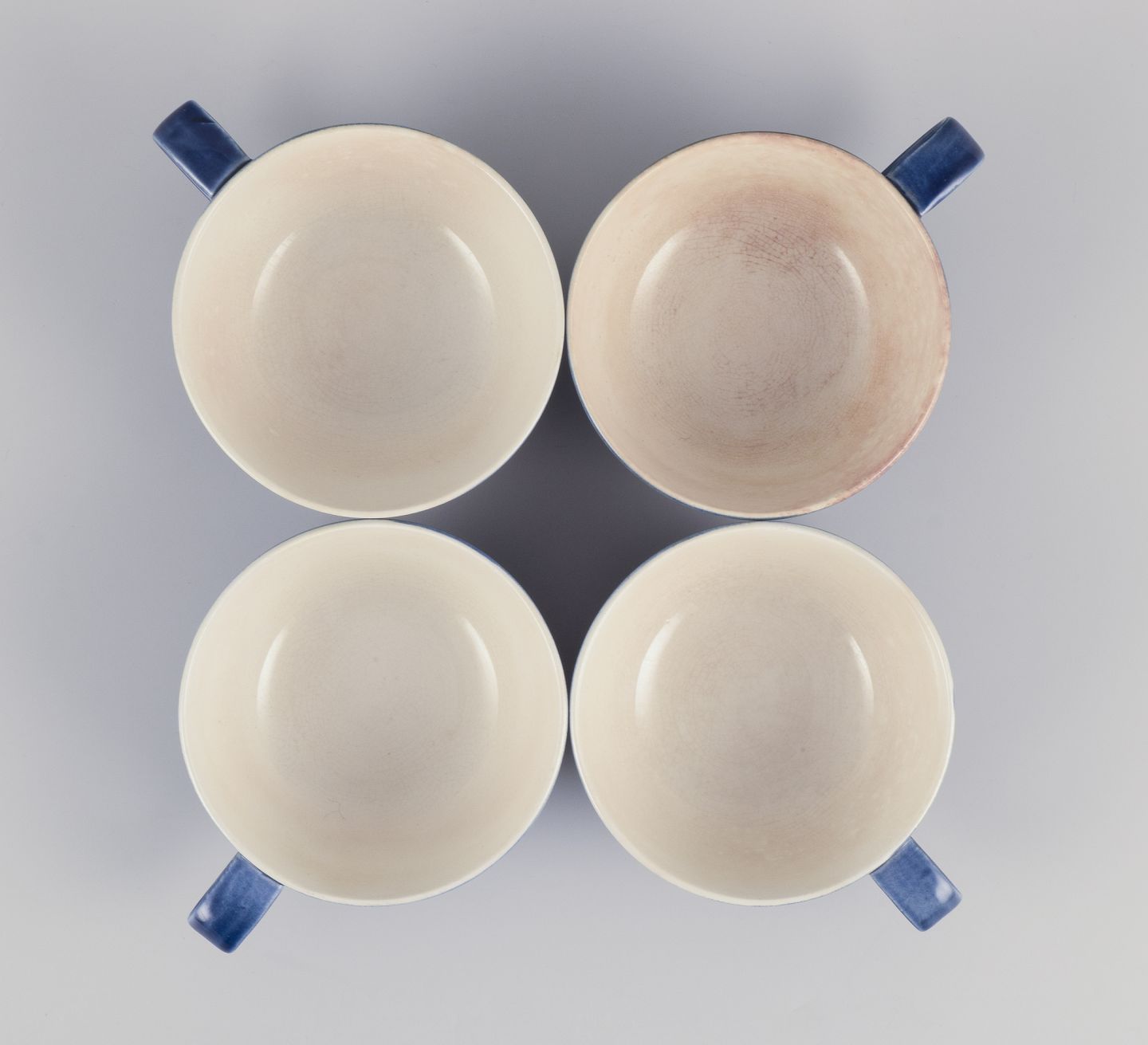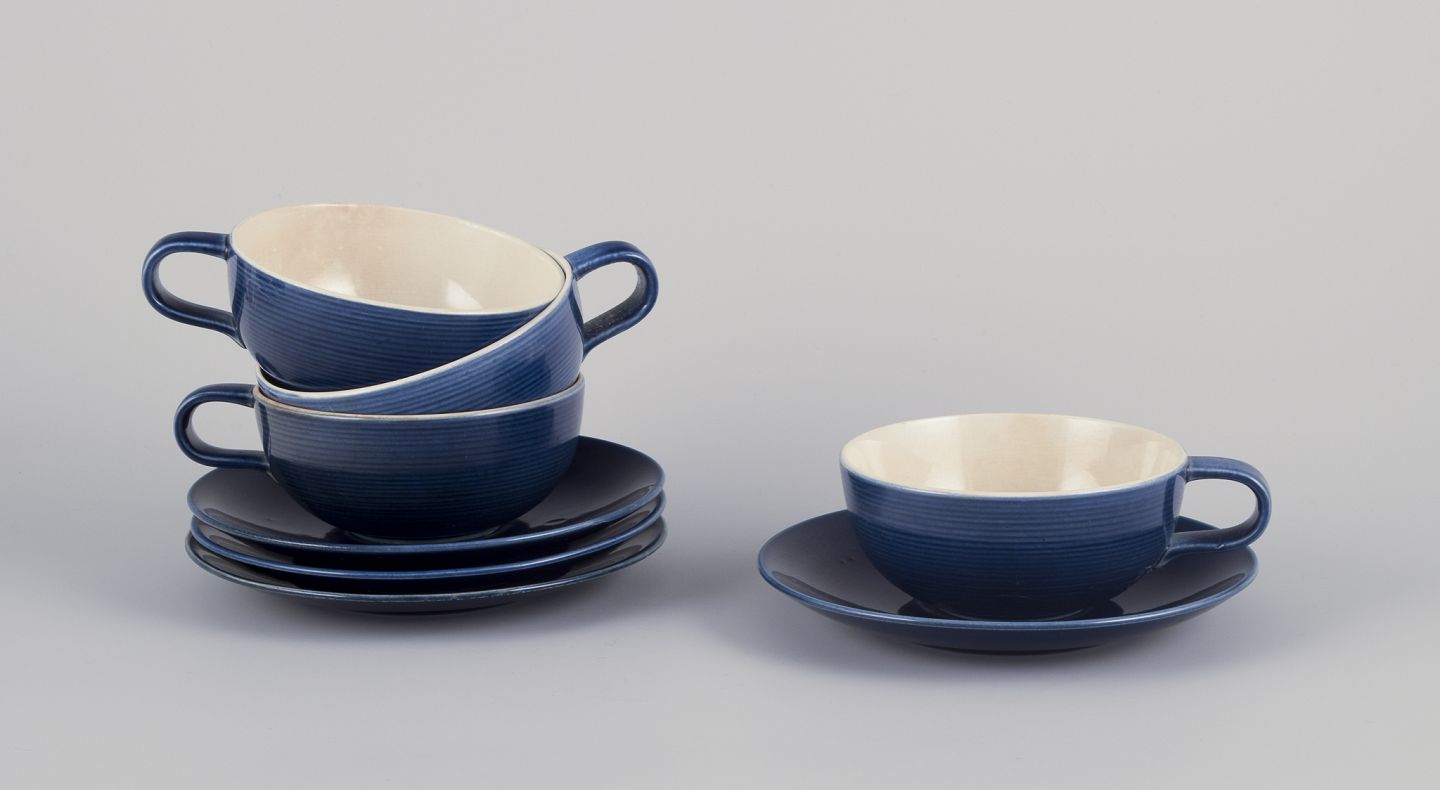 Et sæt fire “Blå Blanche” tekopper med tilhørende underkopper i fajance.