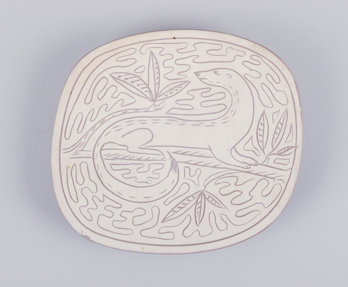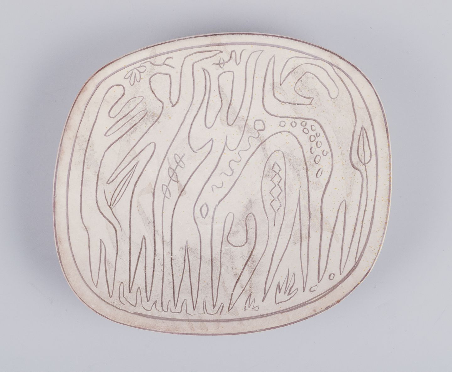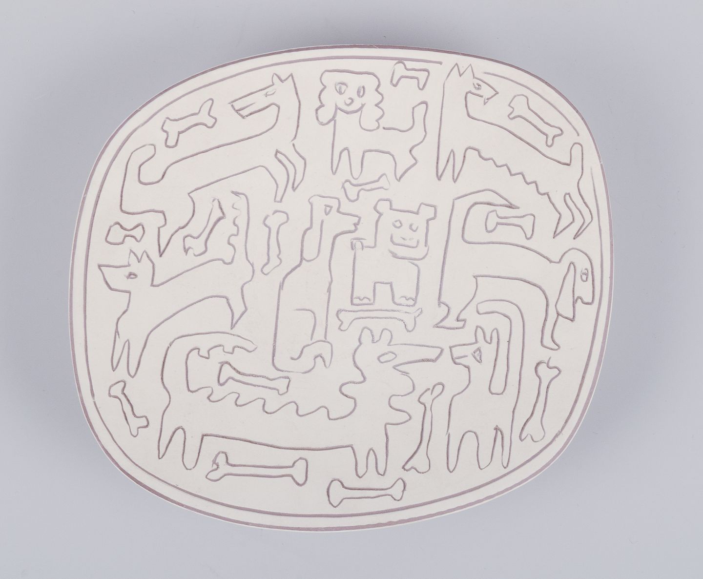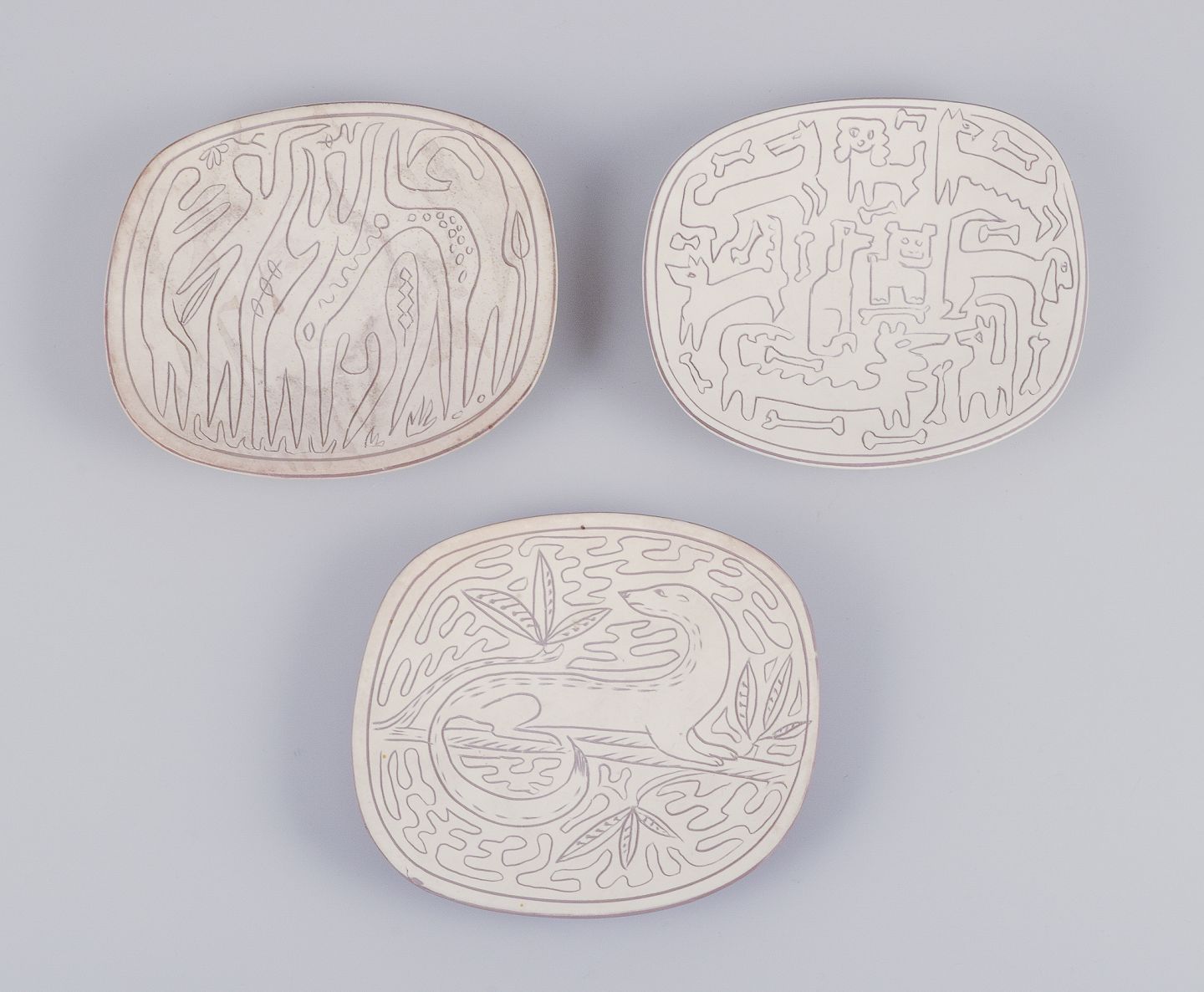 Forskellige dyremotiver indridset på lys bund.