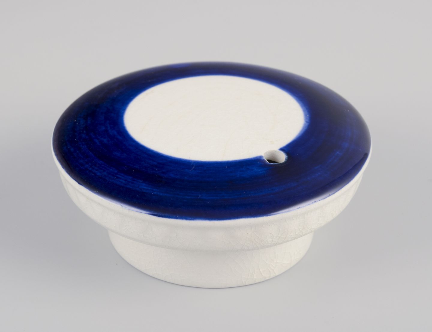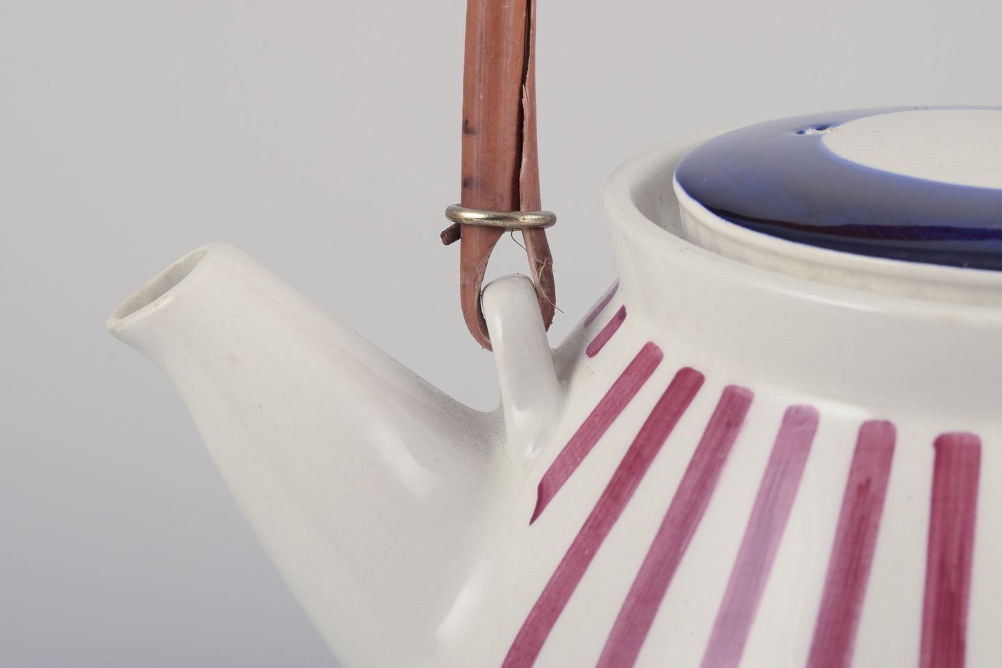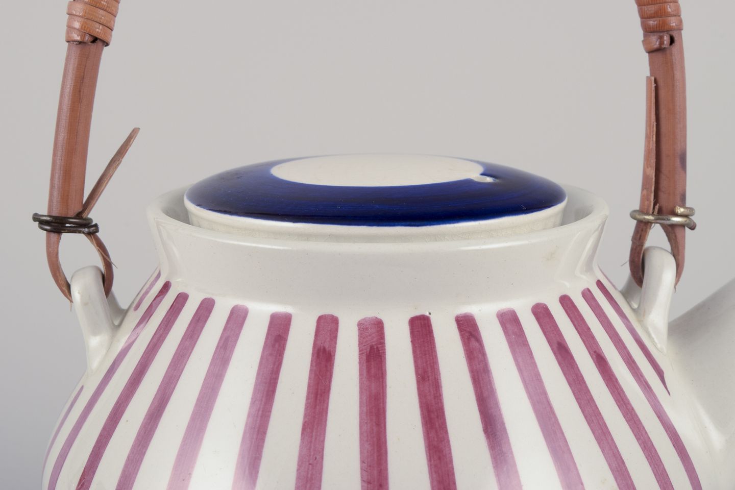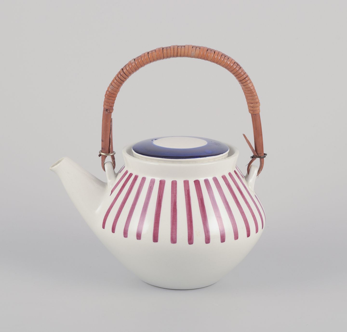 Hand-painted with red stripes and a blue lid on a cream-colored background.