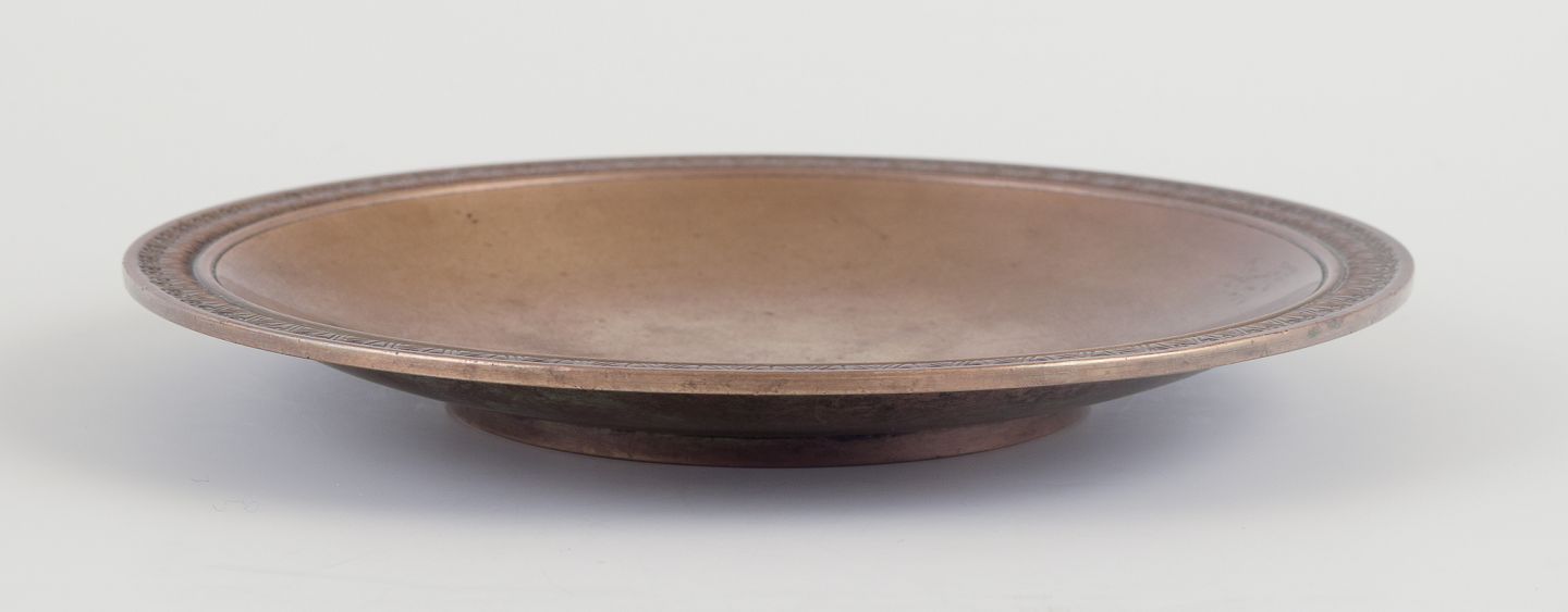 Cirkulær Art Deco skål af patineret bronze.