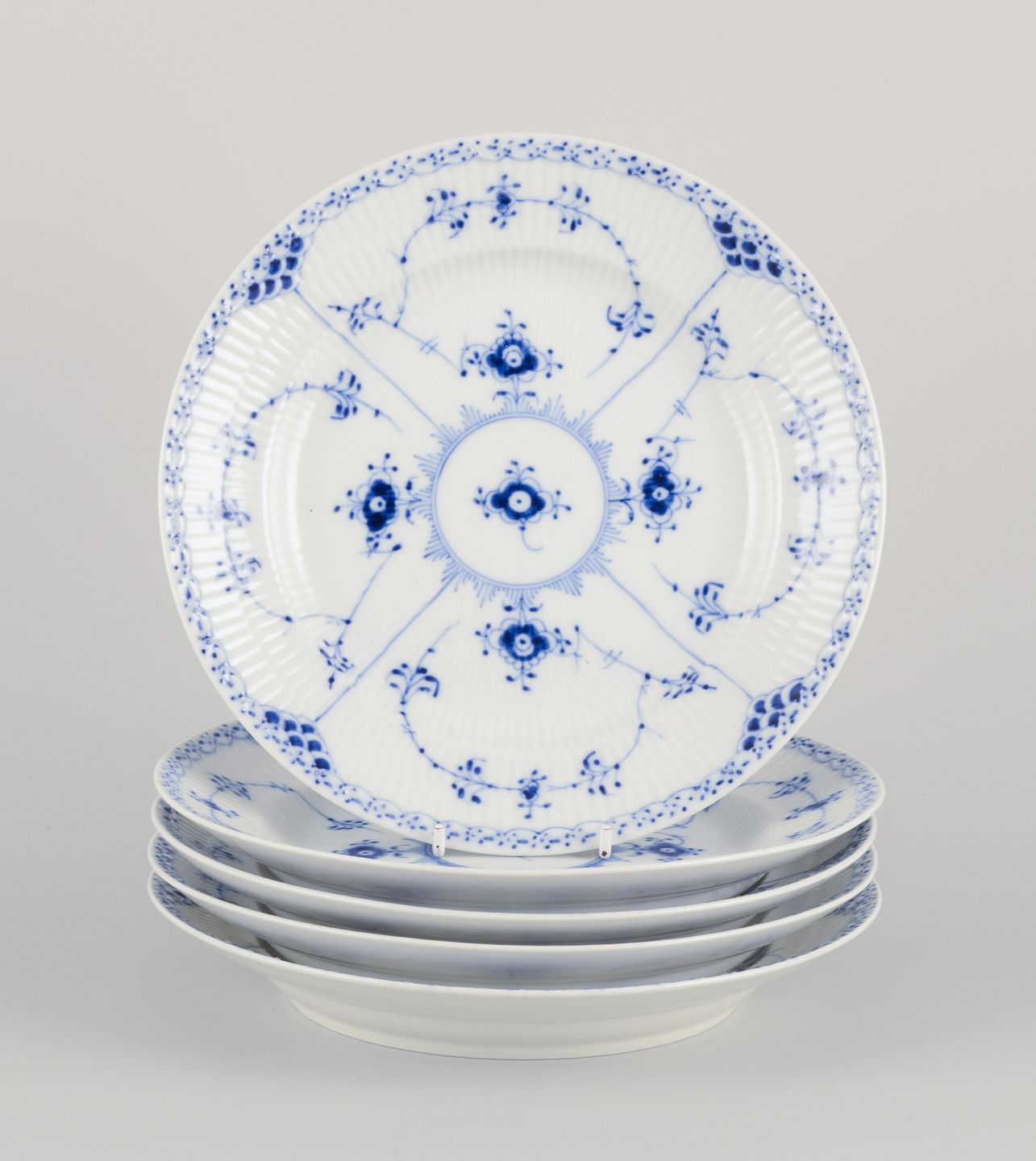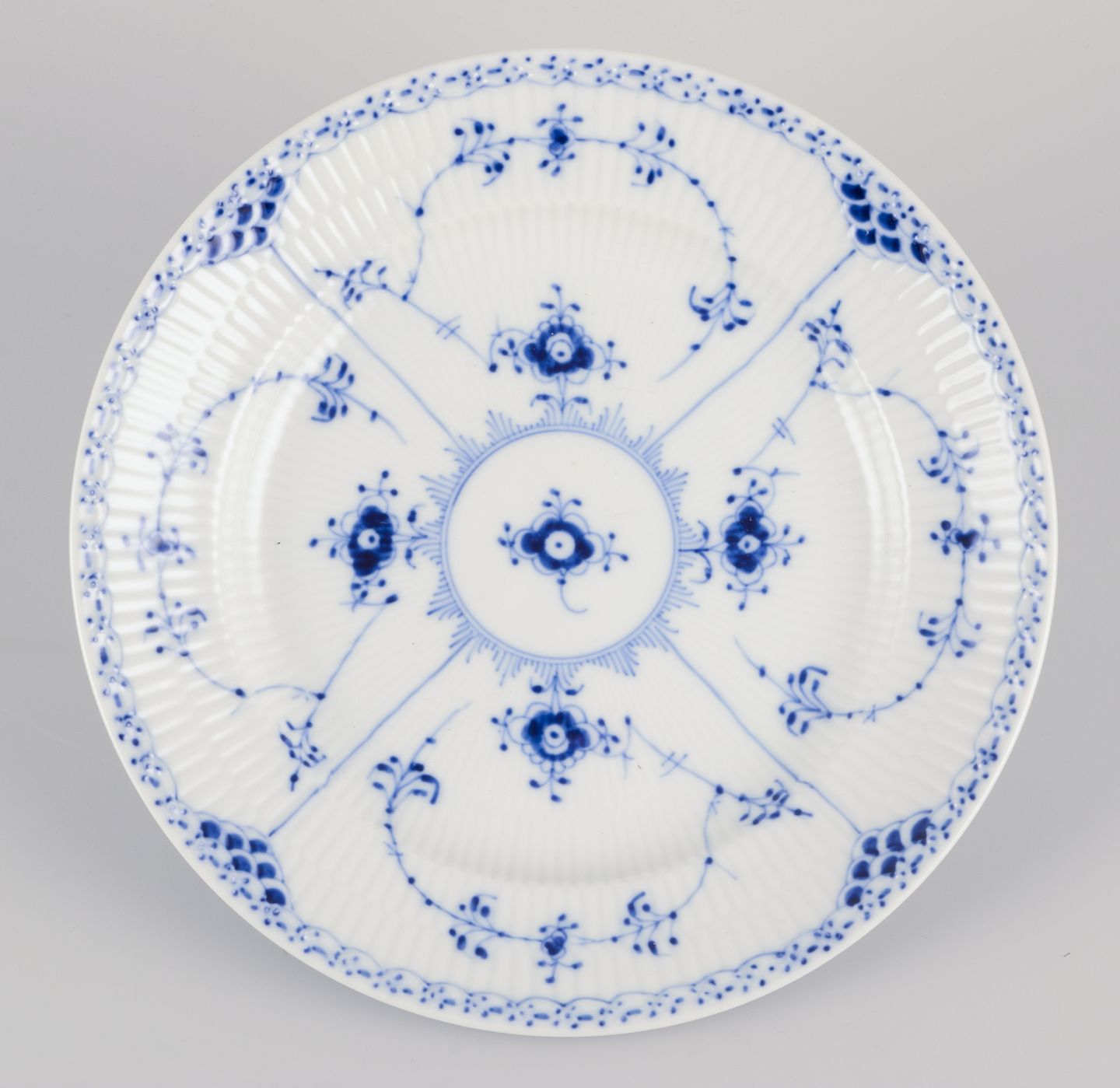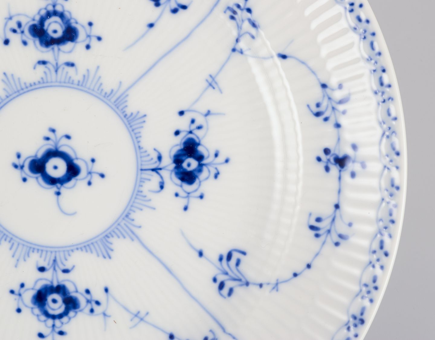 Blue fluted, "musselmalet" comes in three variations: Plain, Half Lace, and Full Lace.