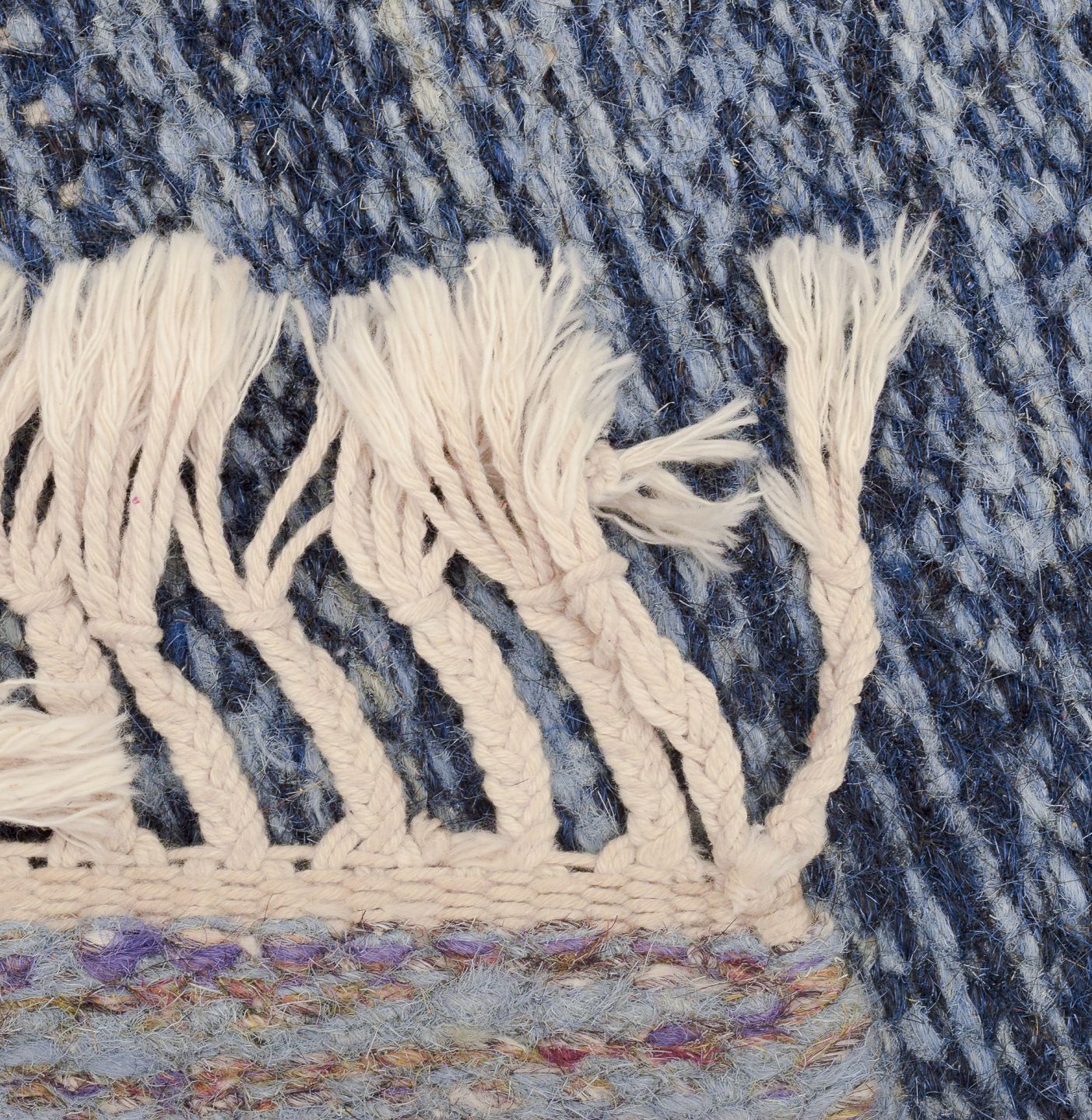 Vævet med geometriske felter i forskellige farver på blå og grøn bund.