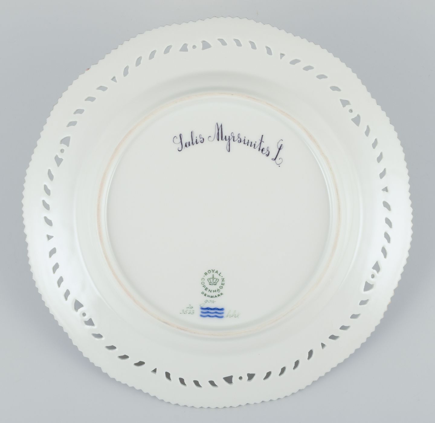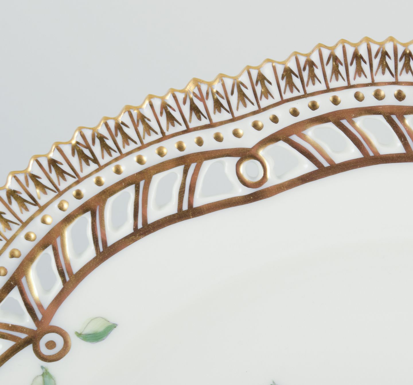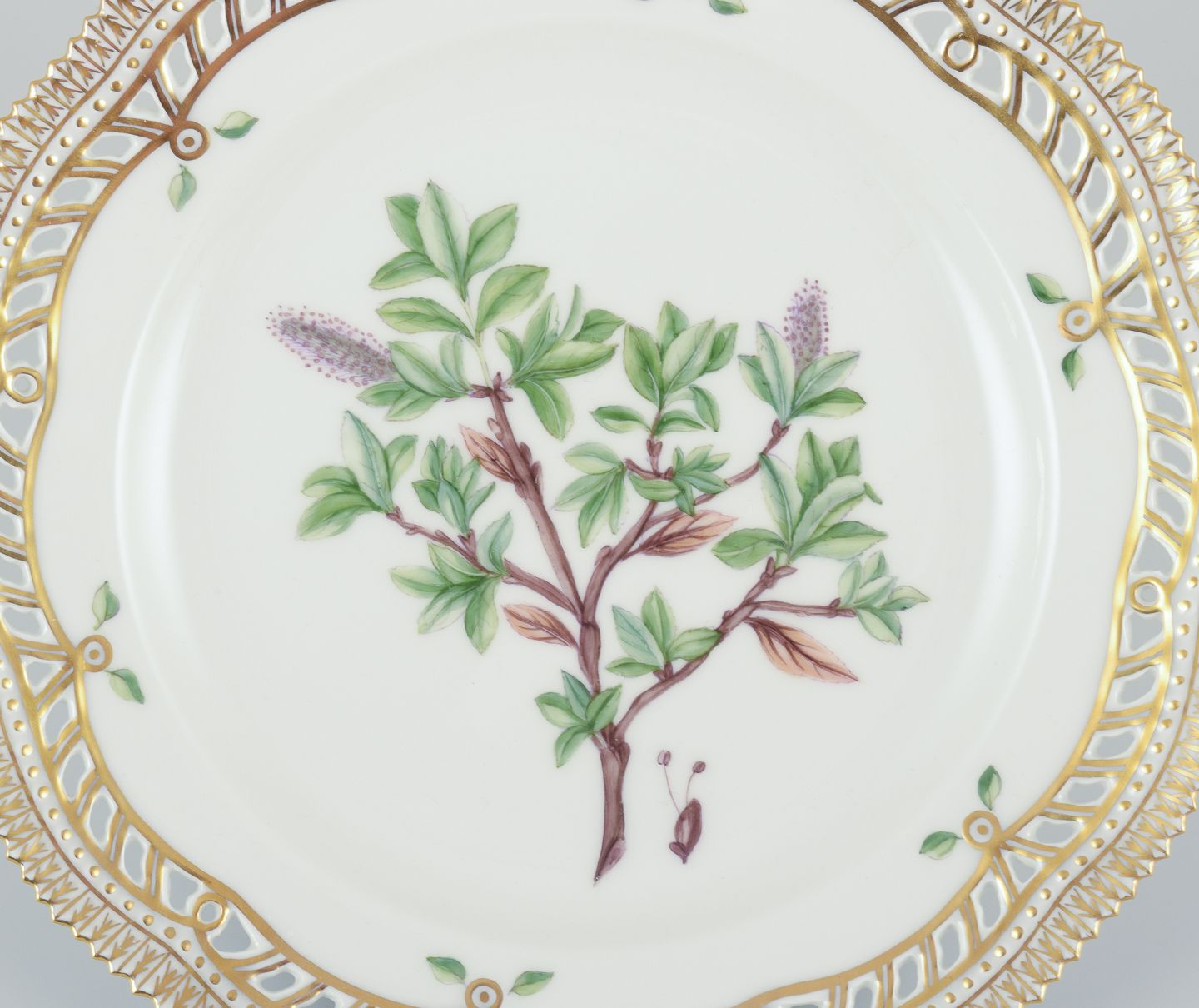 Royal Copenhagen Flora Danica, gennembrudt tallerken i håndmalet porcelæn med blomster og gulddekoration.