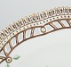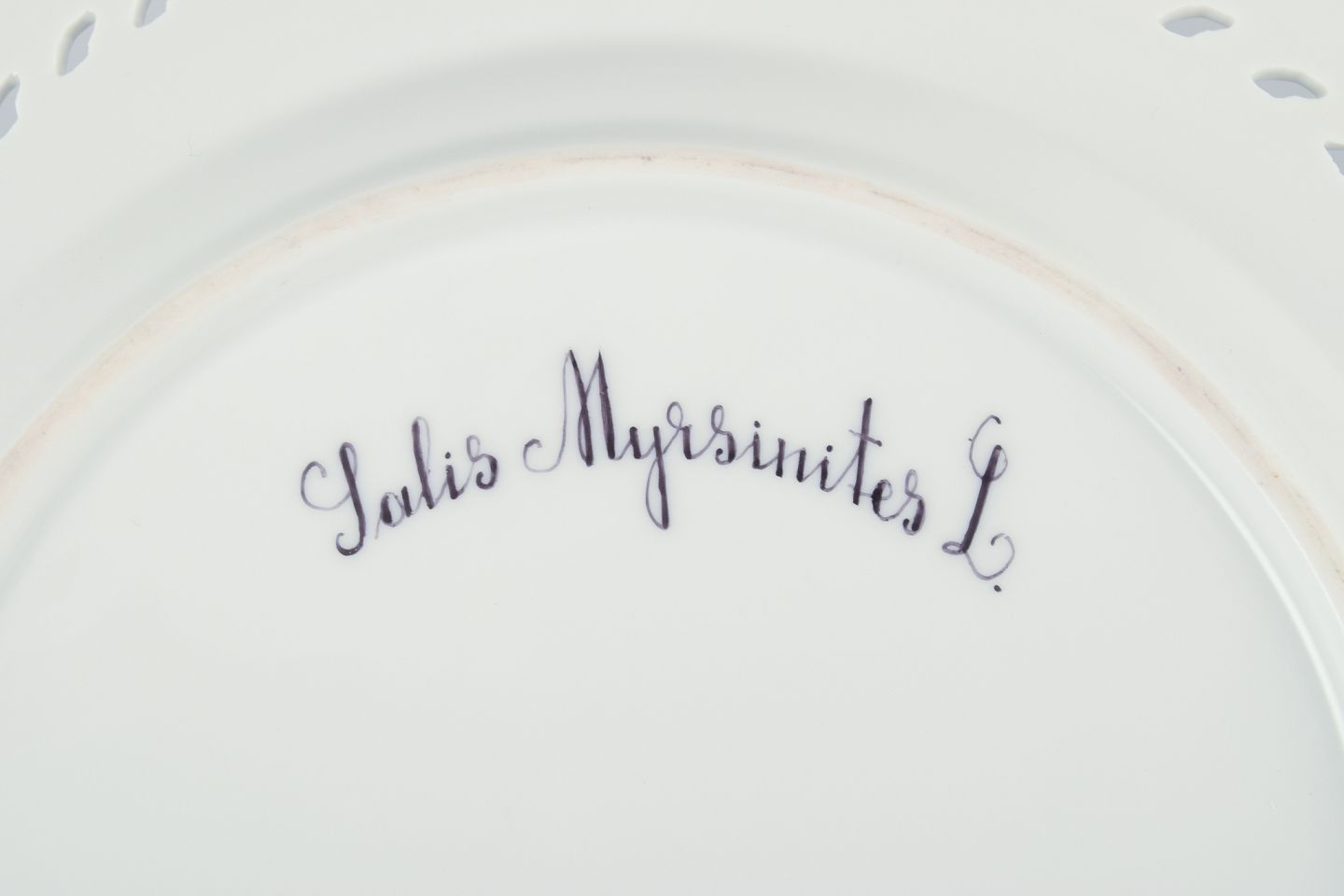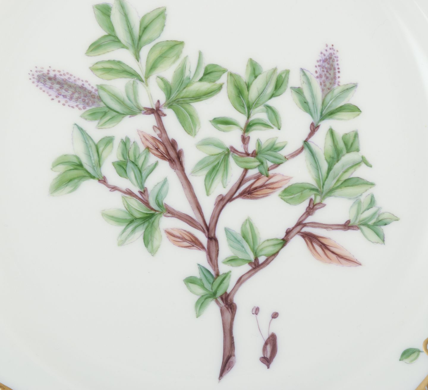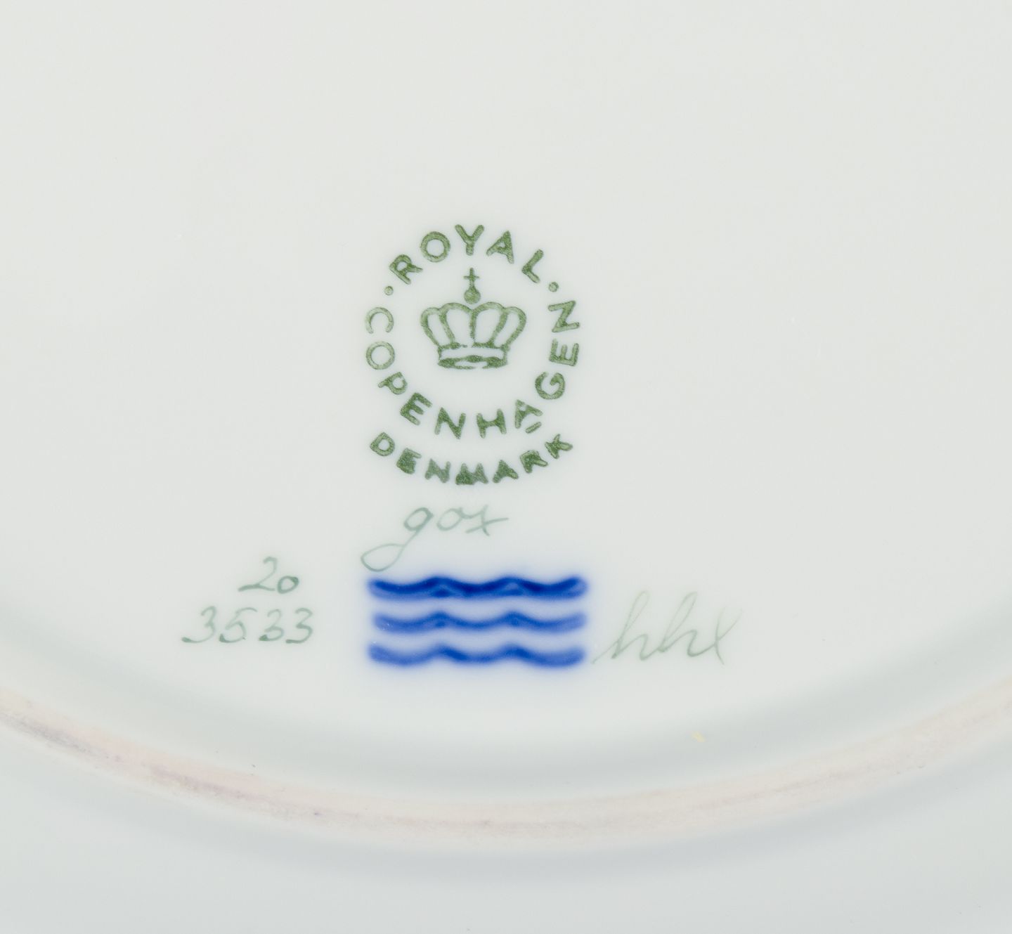Royal Copenhagen Flora Danica, gennembrudt tallerken i håndmalet porcelæn med blomster og gulddekoration.