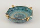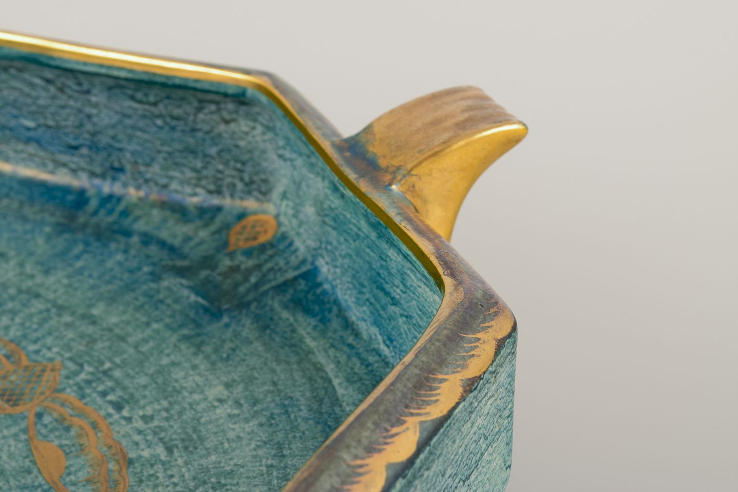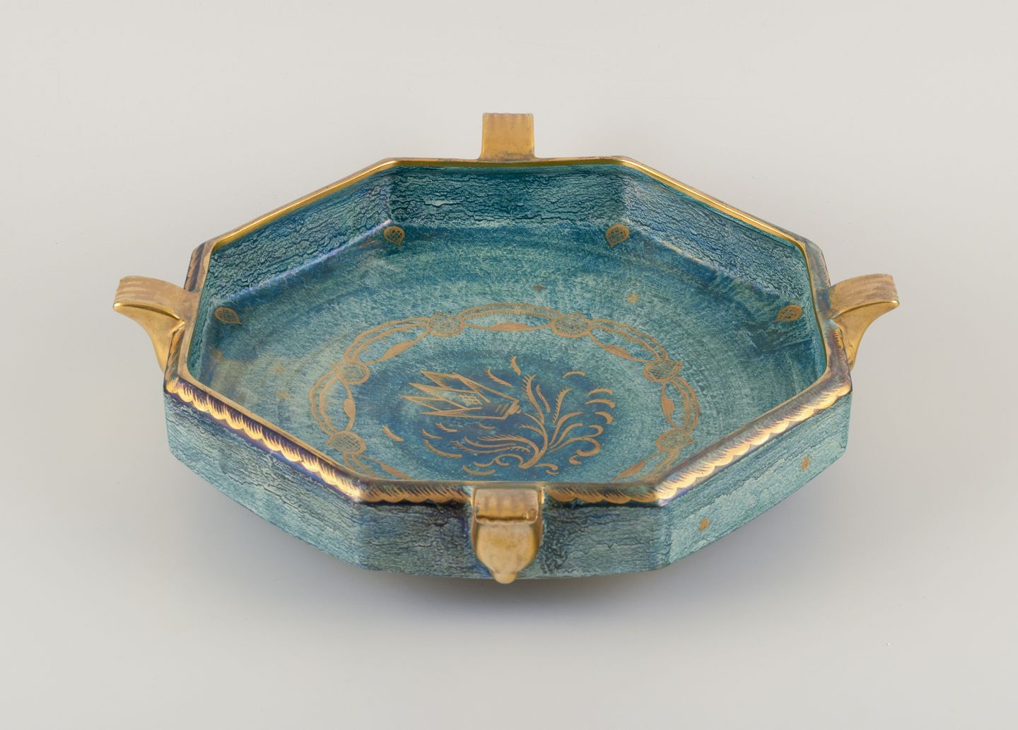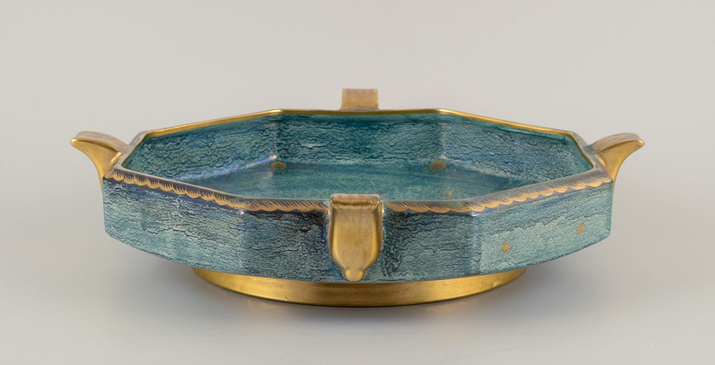 Large octagonal ceramic bowl. Hand painted in green tones with gold decoration.