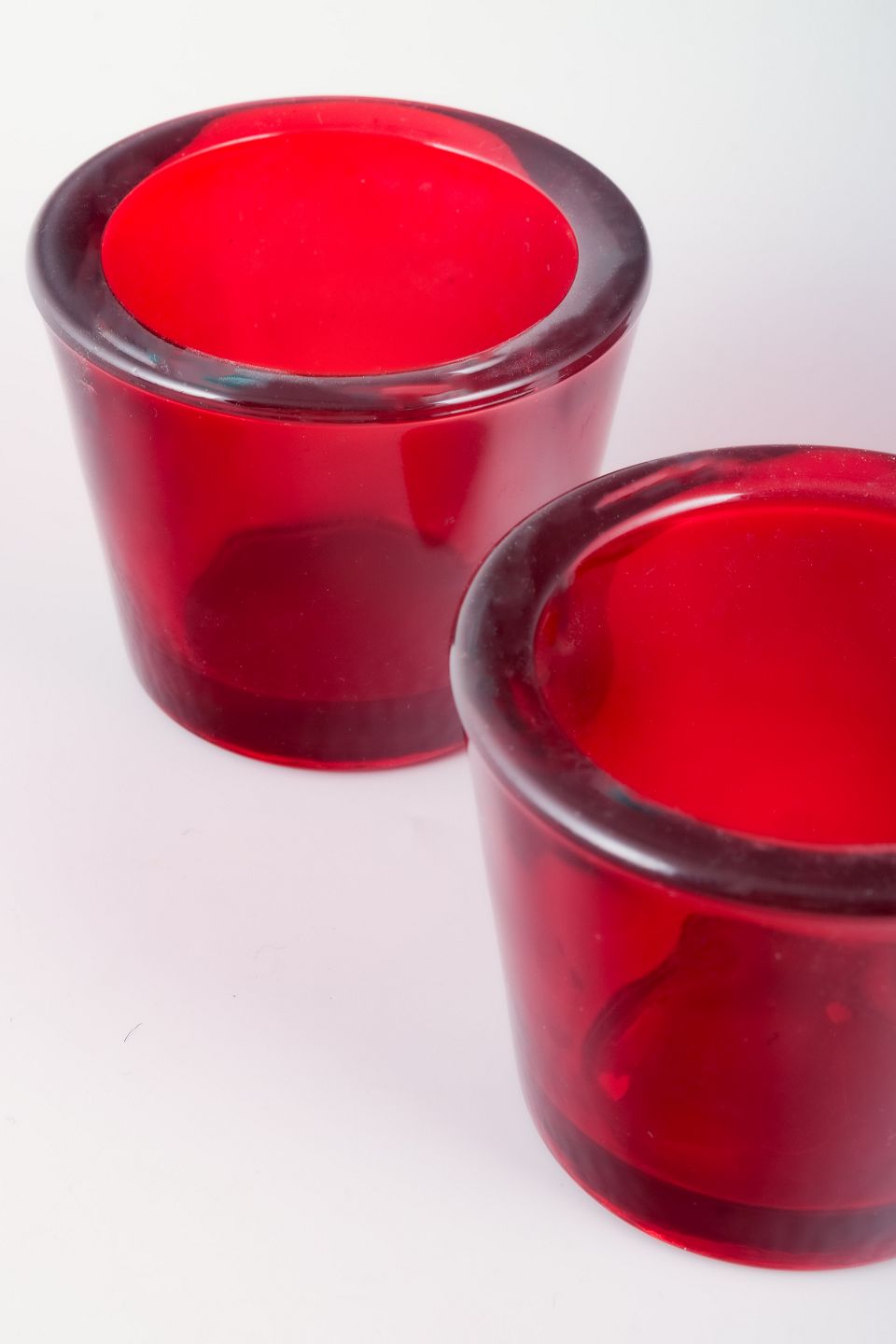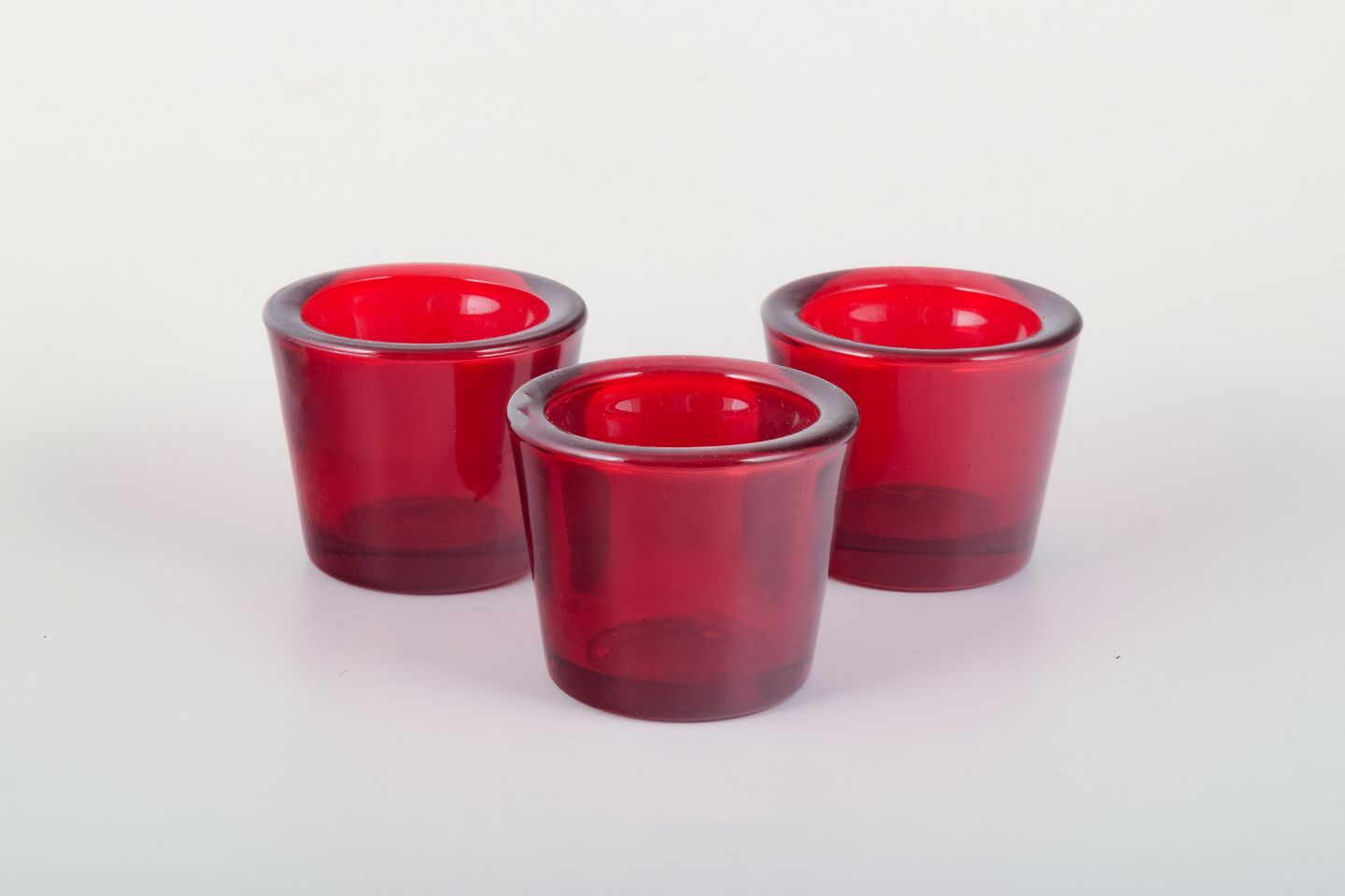 Scandinavian designer. Three tealight holders in red glass. Date: late 20th century. Dimensions: Height approx. 6.5 cm, diameter approx. 8 cm. Condition: Excellent condition.