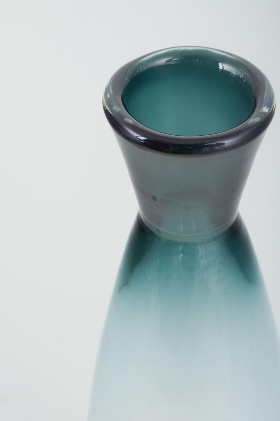 Slank, mundblæst vase i klart glas med konisk korpus og smal hals, tonet fra transparent til blågrøn nuance.