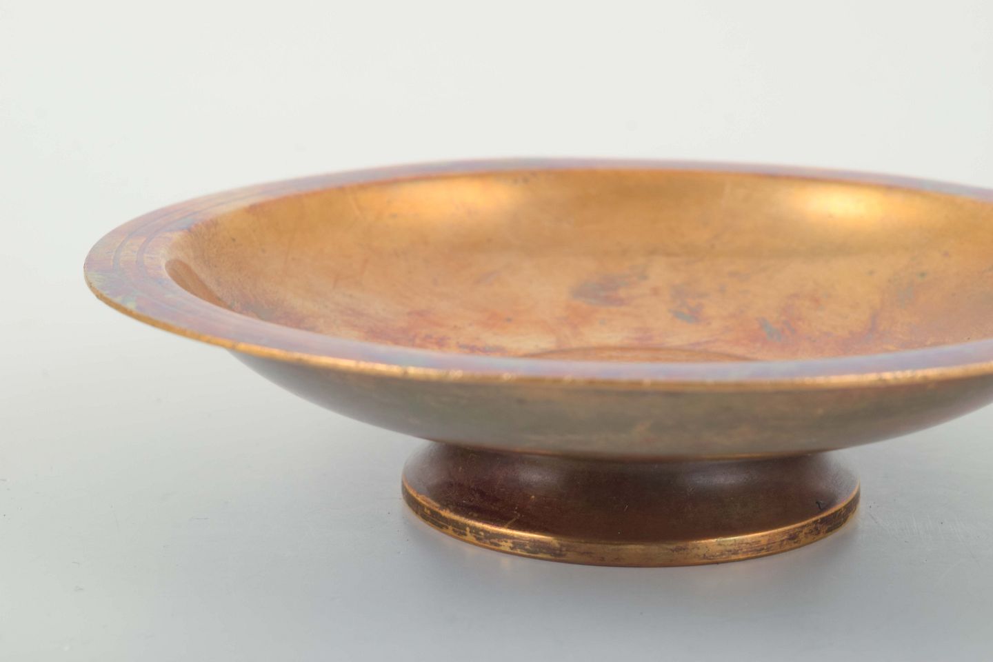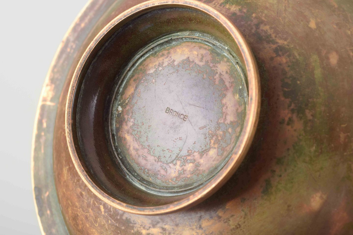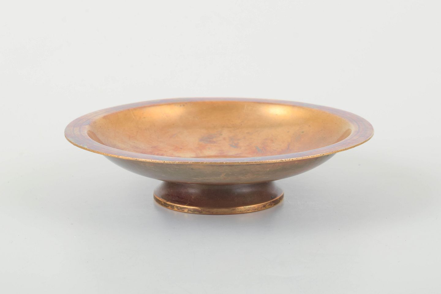 En enkel og dekorativ skål udført i bronce, båret af en lav fod. Den gyldne patinering og de rene linjer giver objektet et tidløst og stilrent udtryk i Art Deco-stil, velegnet som både brugsting og dekorativt element.