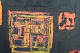 Et ekspressivt abstrakt værk opbygget af geometriske felter i stærke farver med en mørk baggrund, hvor kontrasten mellem neonagtige røde og gule former og det dybere blå skaber en markant billedvirkning.