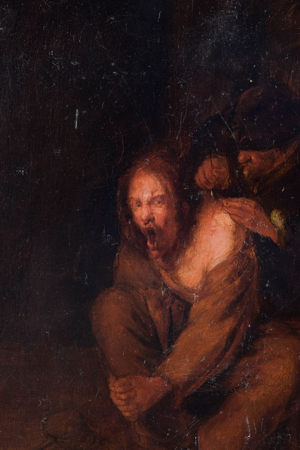 Et dramatisk og mørkt interiørmaleri med en siddende mand, der fastholdes og tilsyneladende undersøges eller tortureres af en anden figur i skyggerne, mens en tredje person ved et bord optaget læser eller skriver. Scenen er stærkt ladet og udført i en chiaroscuro-domineret palette med brune og ravfarvede toner, tydeligt inspireret af barokkens dramatiske lysføring.