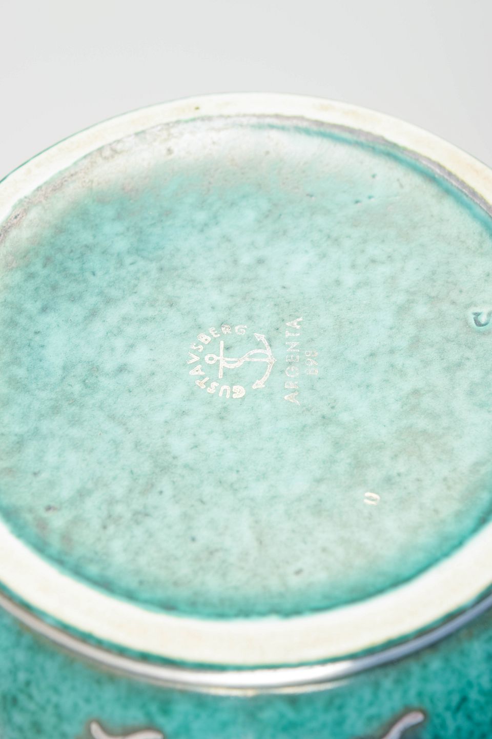 Wilhelm Kåge (1889–1960) was chief designer at Gustavsberg from 1917 and one of the most influential figures in Swedish ceramics. His Argenta series, launched in the 1930s, combines cool glazes with elegant silver inlays and is considered a masterpiece of Scandinavian Art Deco.