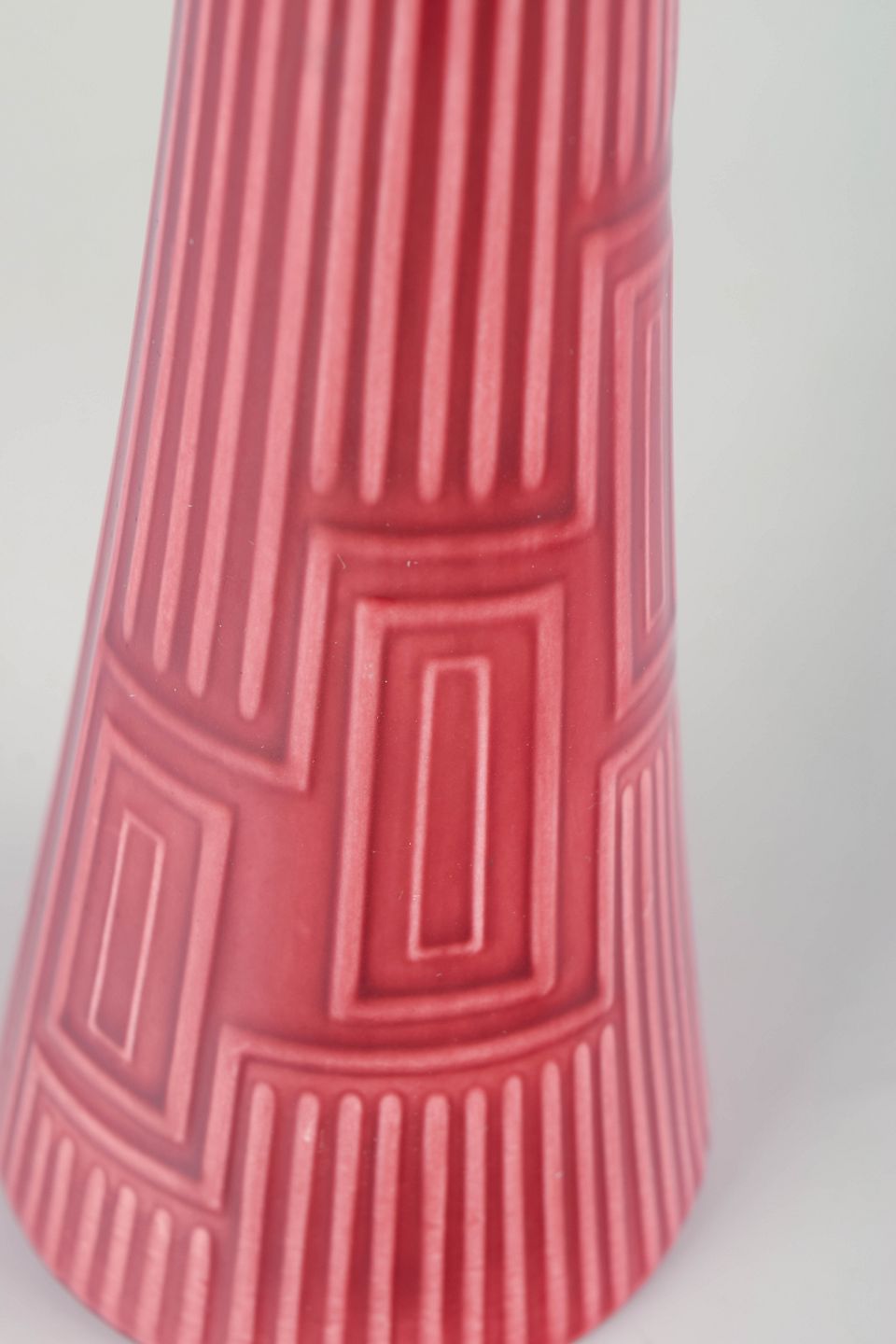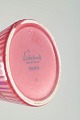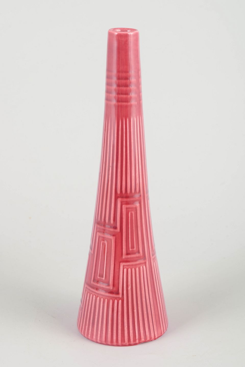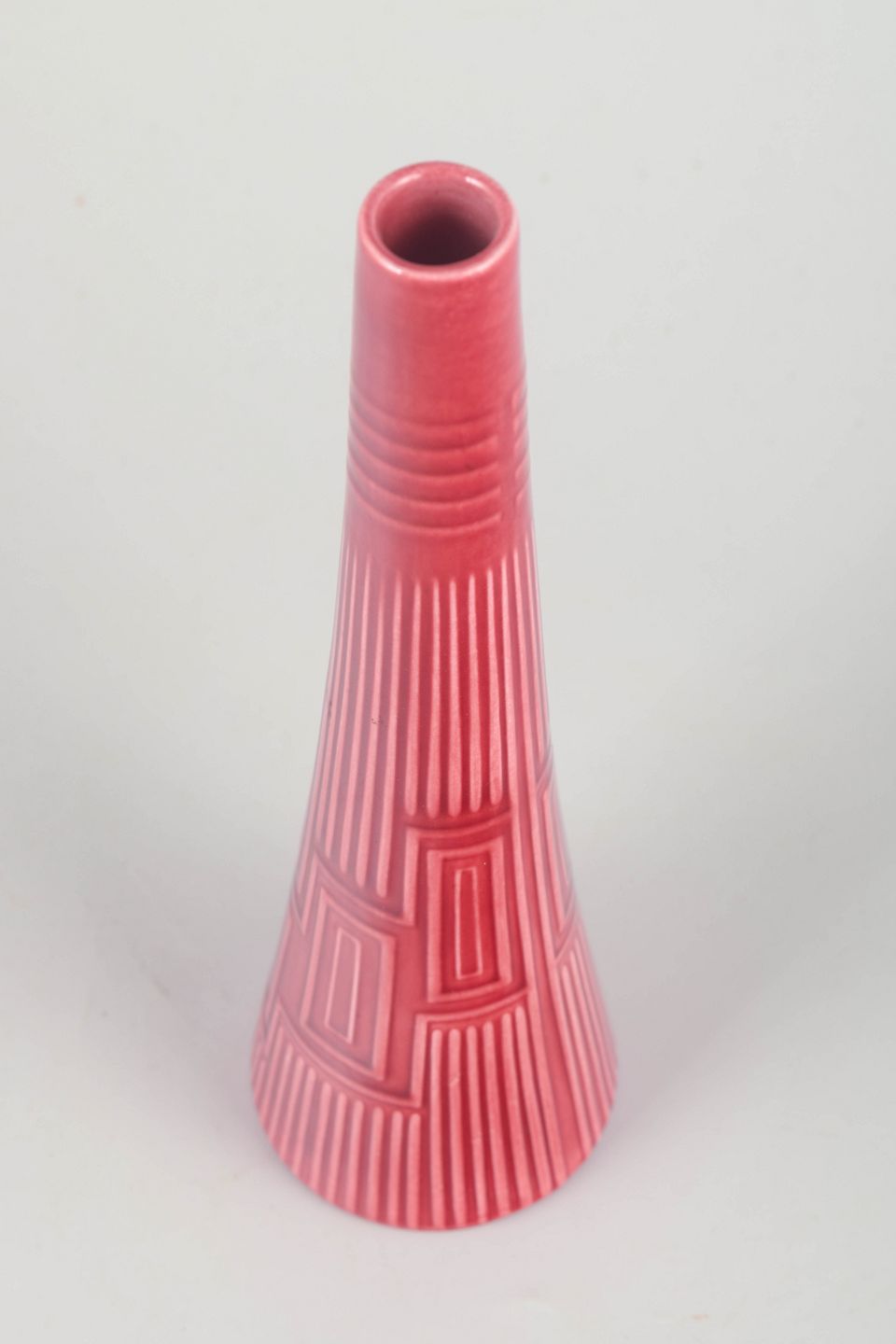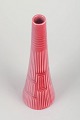 Sjælden konisk vase i glaseret keramik i rosa farvetone med geometrisk reliefmønster og fine vertikale rifler. Stemplet “Lidabruk Rörstrand Kairo” under bunden.
