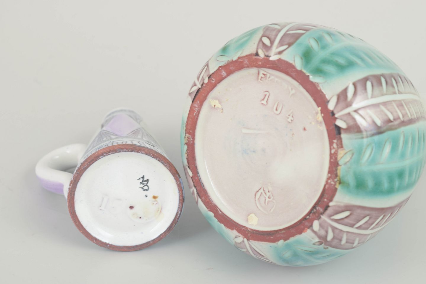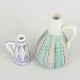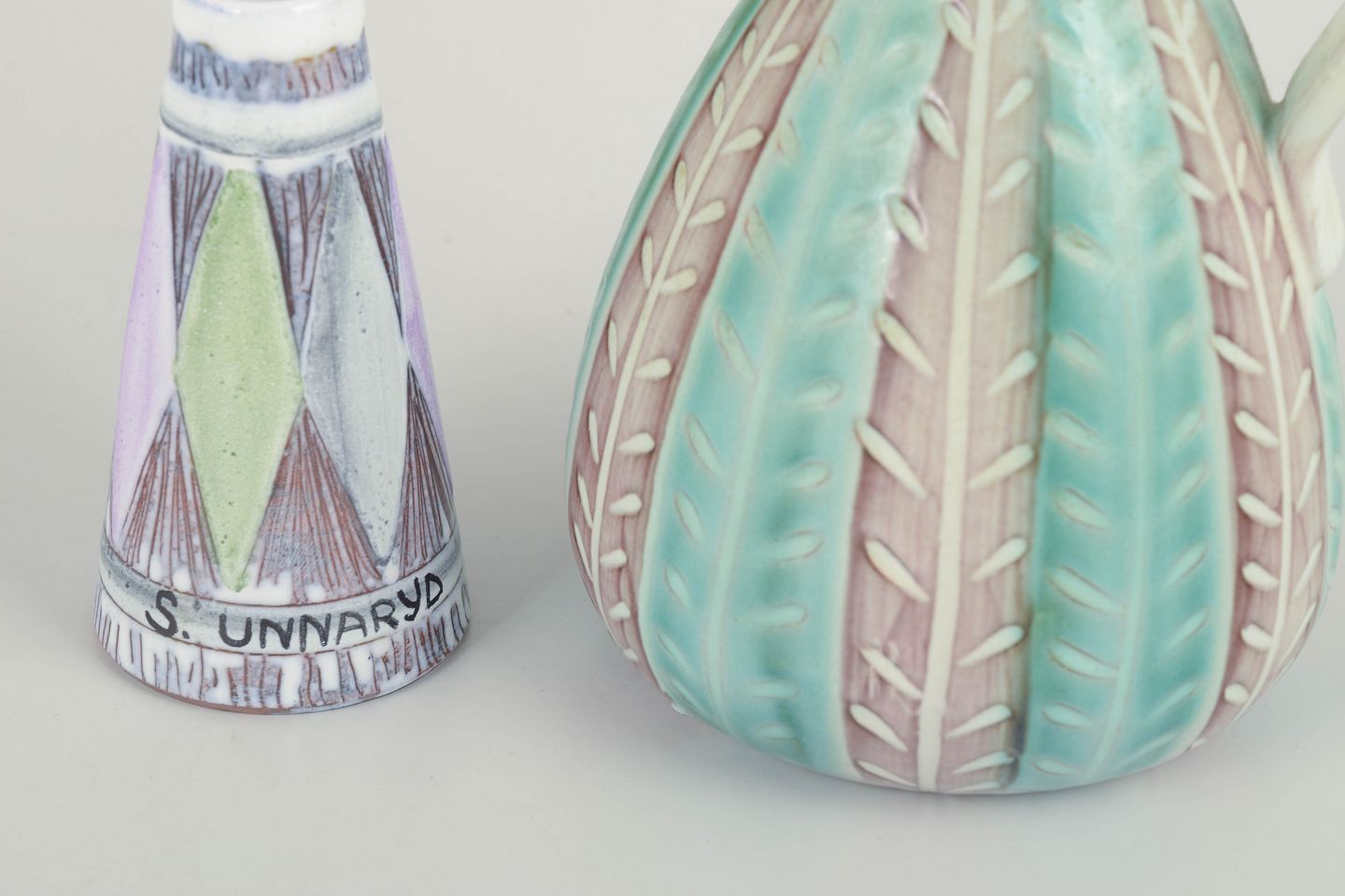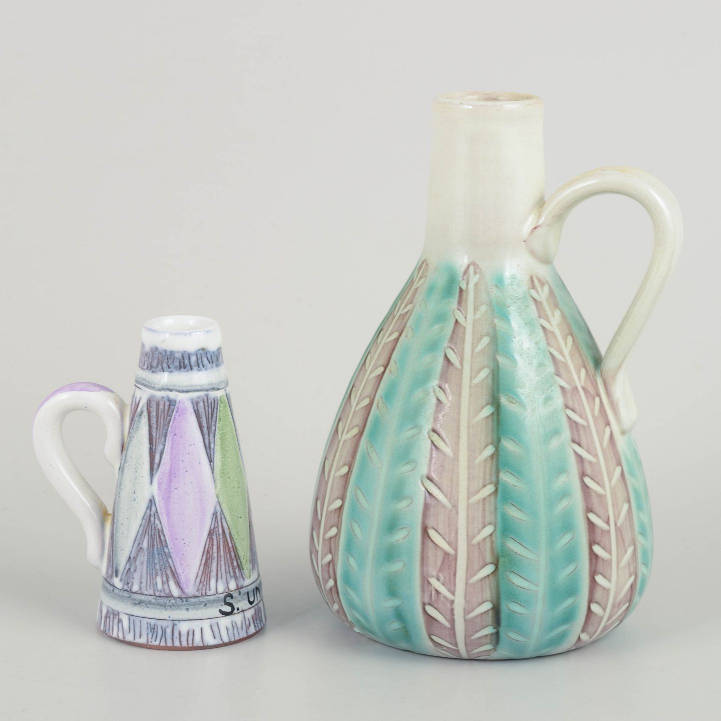 Smukke keramiske kander designet af Ingrid Atterberg og Mari Simmulson for Upsala Ekeby. Begge dekoreret i pasteltoner med indridset mønster og håndmalet glasur. De to kander udviser kunstnernes karakteristiske formsprog og farvesans fra 1960’ernes svenske keramiktradition.