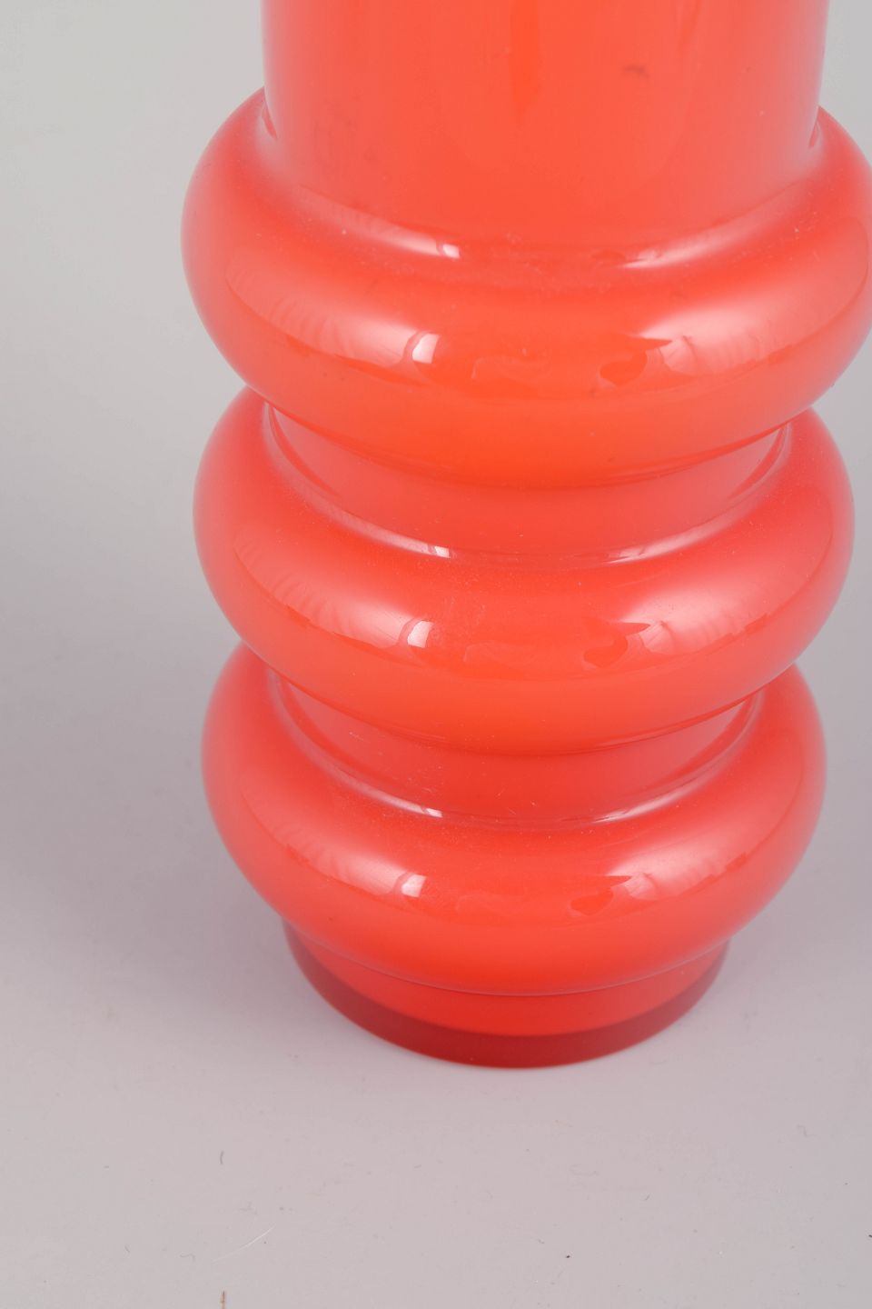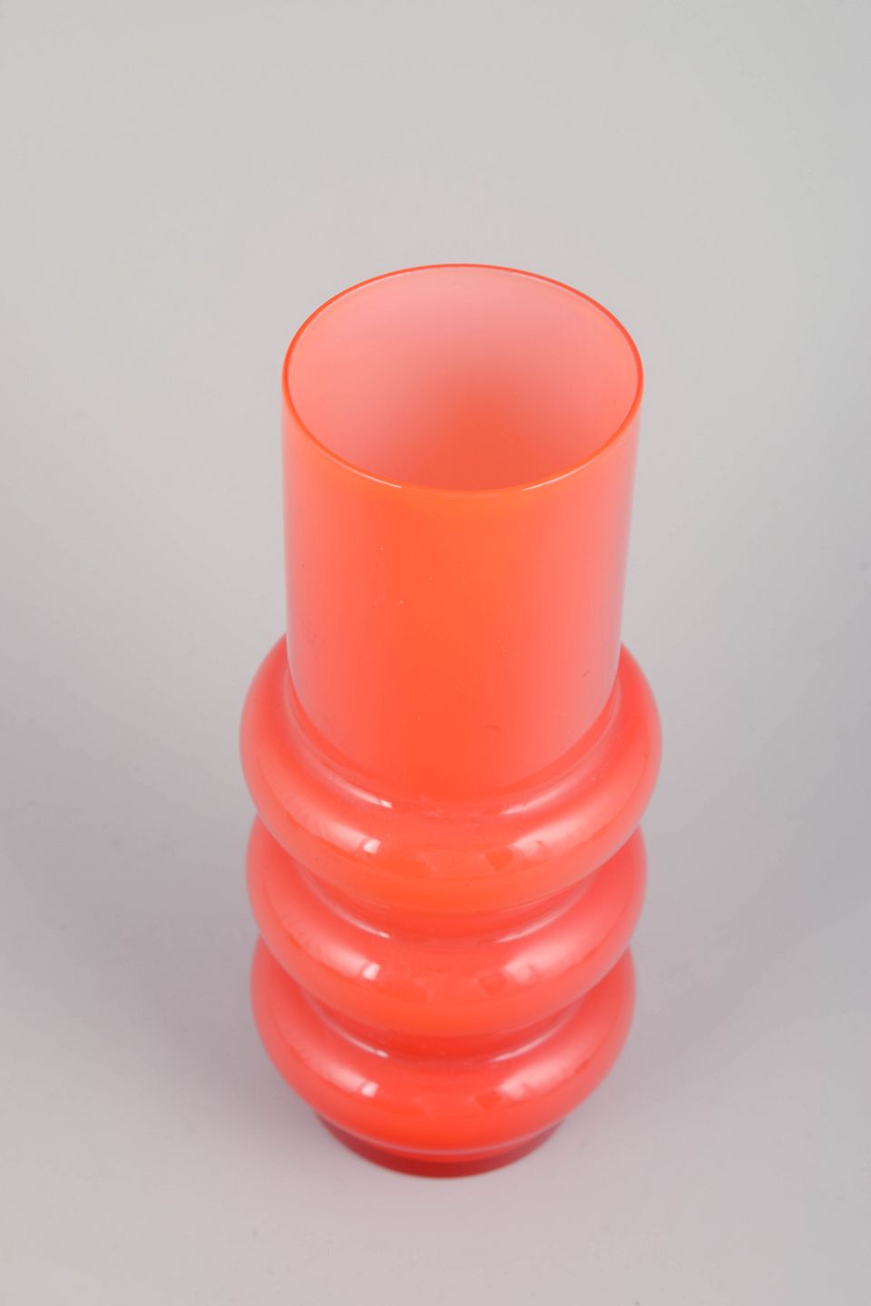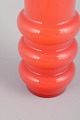 Mouth-blown vase in vivid orange glass with a striking sculptural form featuring a cylindrical body with three rounded bands. A characteristic piece of 1970s Swedish glass art, where colour and shape served as central decorative elements.