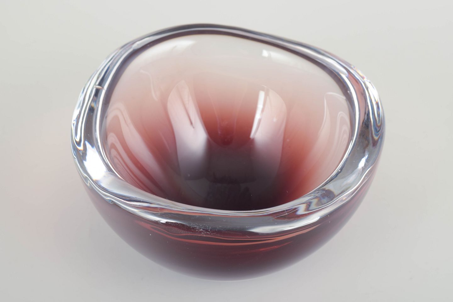 Organically shaped bowl in mouth-blown glass with layered colour effects in deep ruby and clear tones, typical of Murano glass from the period.