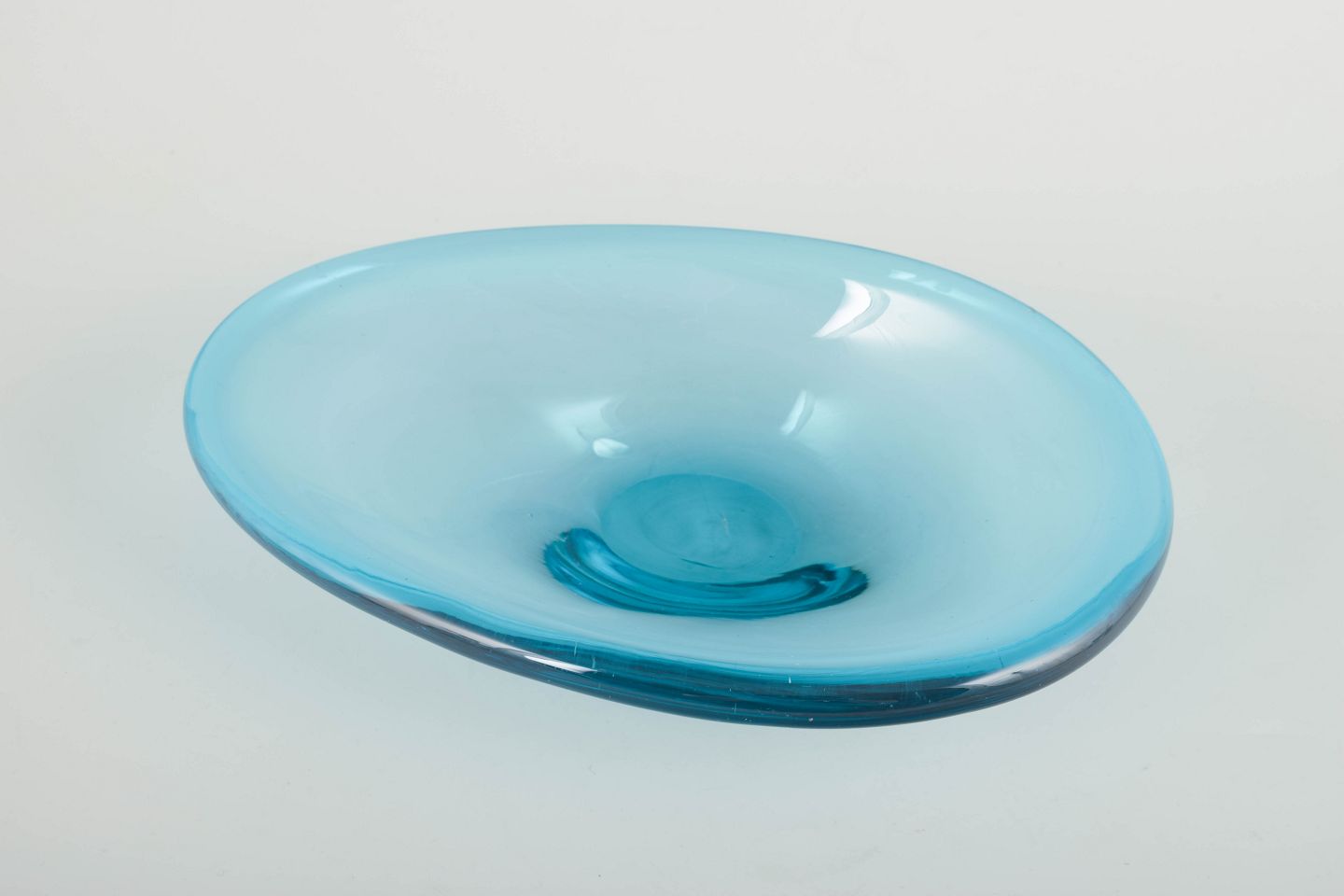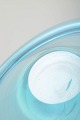 Organisk formet mundblæst skål i turkisblåt glas med tykke vægge og blødt svungen form, typisk for skandinavisk glasdesign fra perioden.